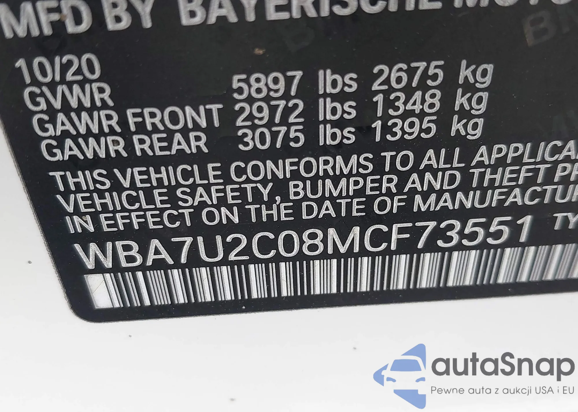 LOT: 44304575 VIN: WBA7U2C08MCF73551