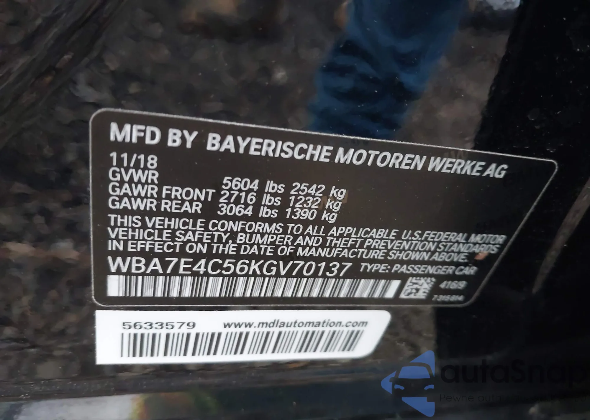 LOT: 43667565 VIN: WBA7E4C56KGV70137
