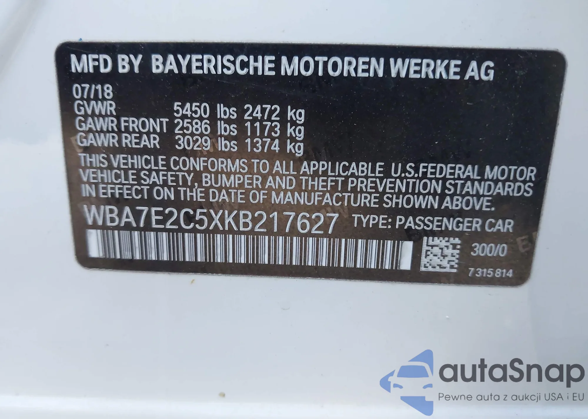 LOT: 43714840 VIN: WBA7E2C5XKB217627
