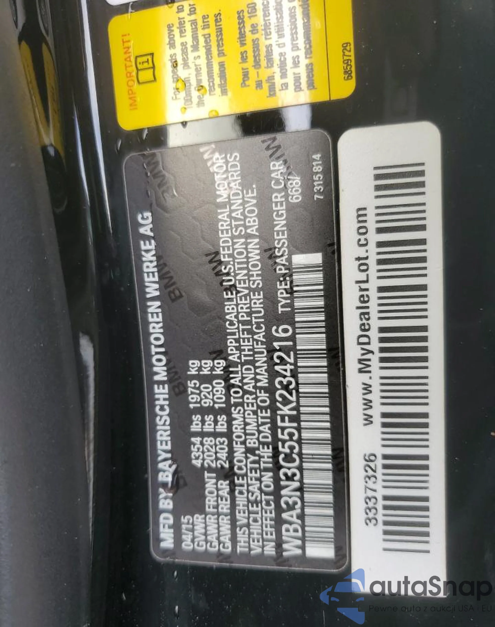 LOT: 85472805 VIN: WBA3N3C55FK234216