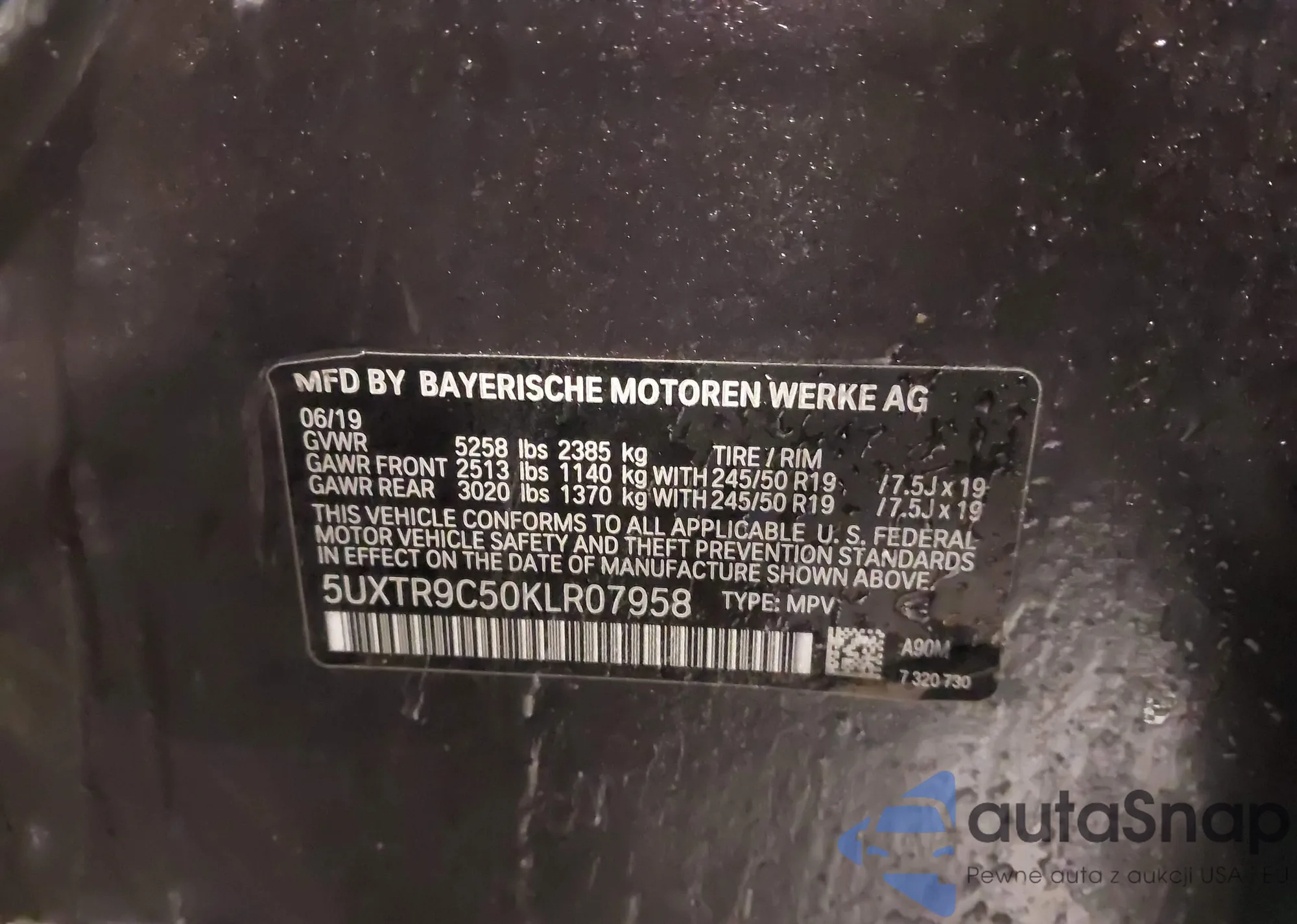 • VIN 5UXTR9C50KLR07958