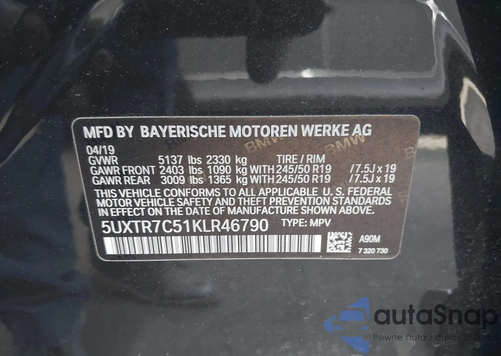 LOT: 44338755 VIN: 5UXTR7C51KLR46790