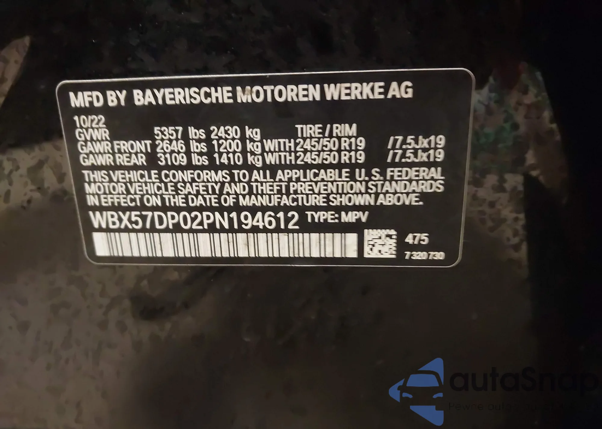 LOT: 44368490 VIN: WBX57DP02PN194612