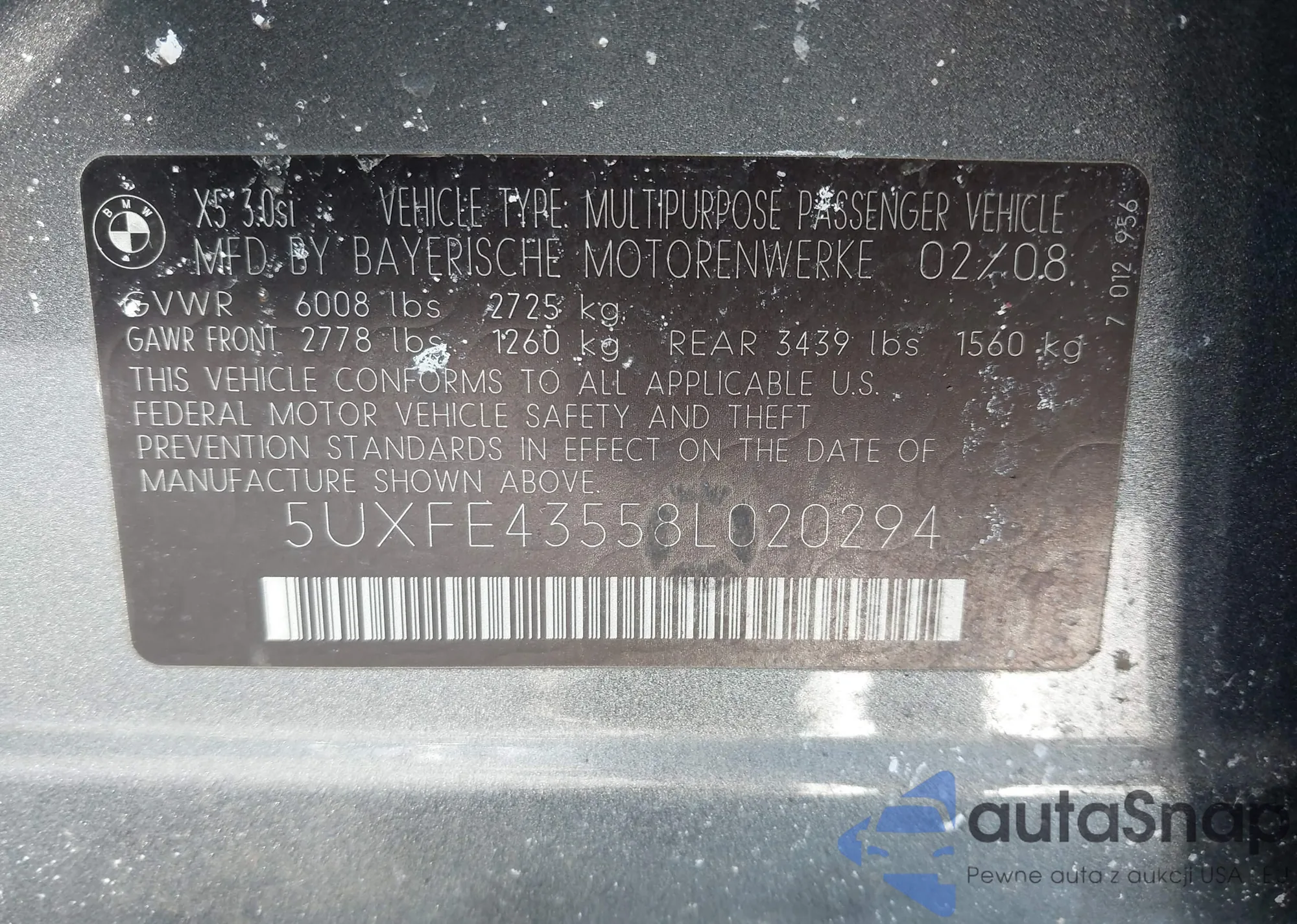 • VIN 5UXFE43558L020294