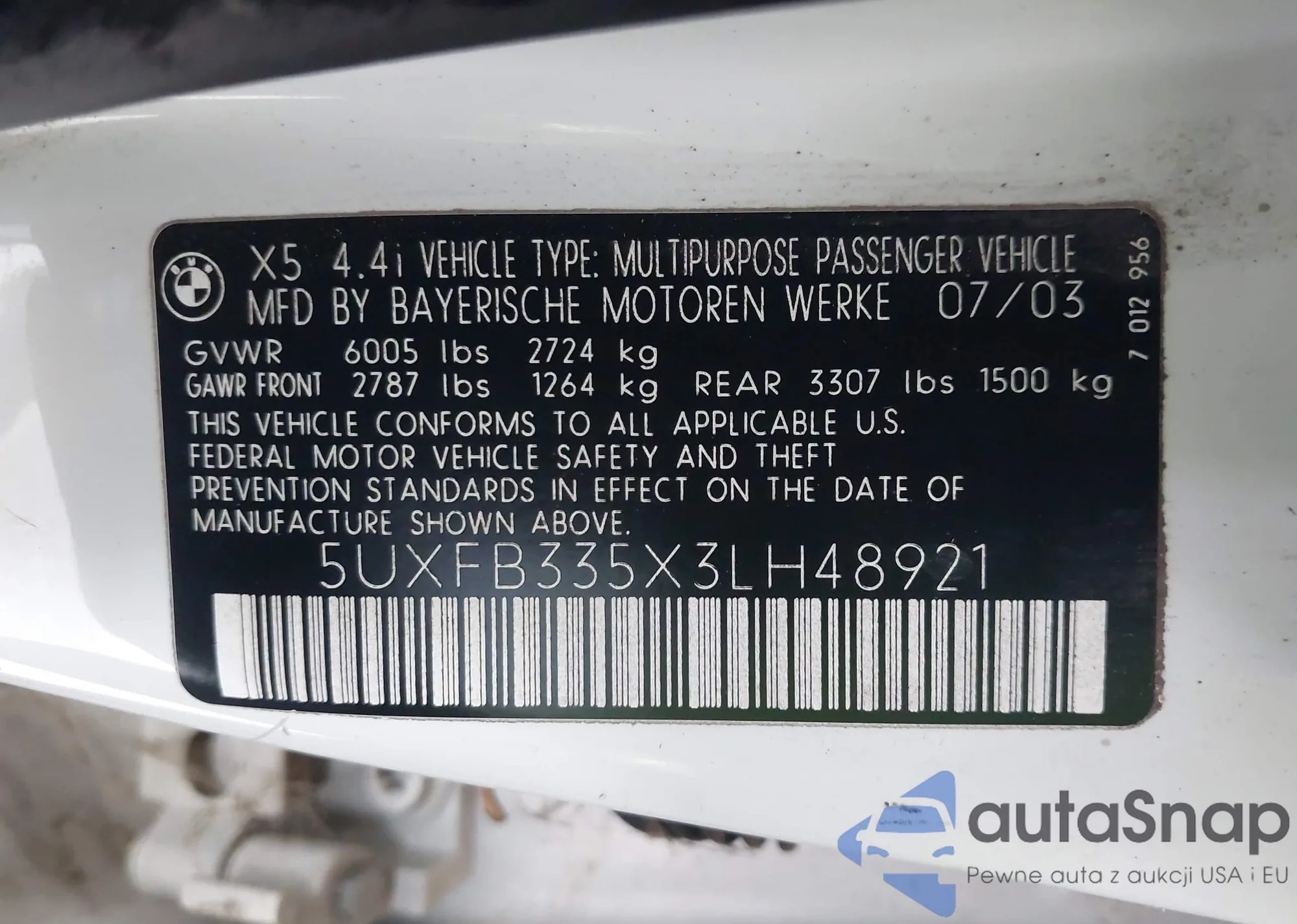 2003 BMW X5 4.4I from USA, damaged, VIN 5UXFB335X3LH48921