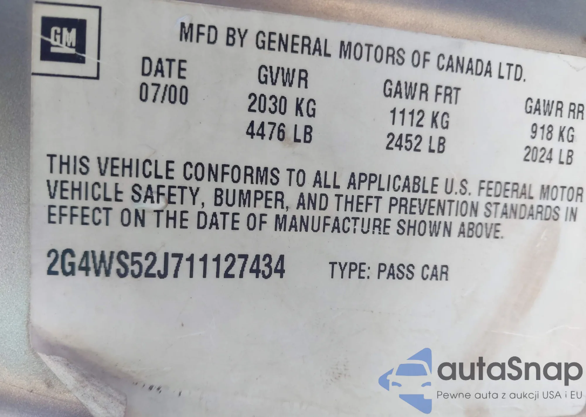 LOT: 44310154 VIN: 2G4WS52J711127434