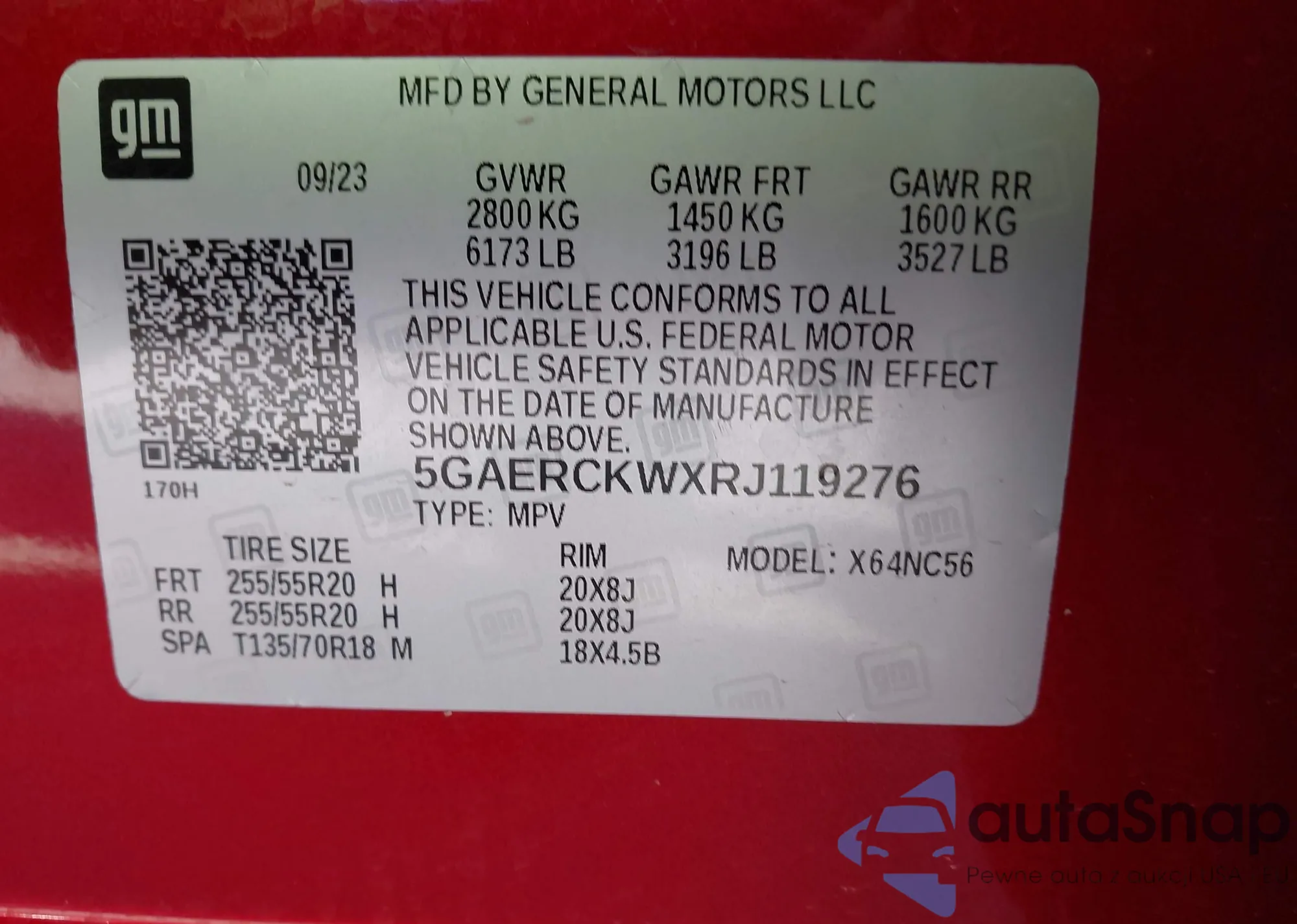 LOT: 94880275 VIN: 5GAERDKW6RJ116963