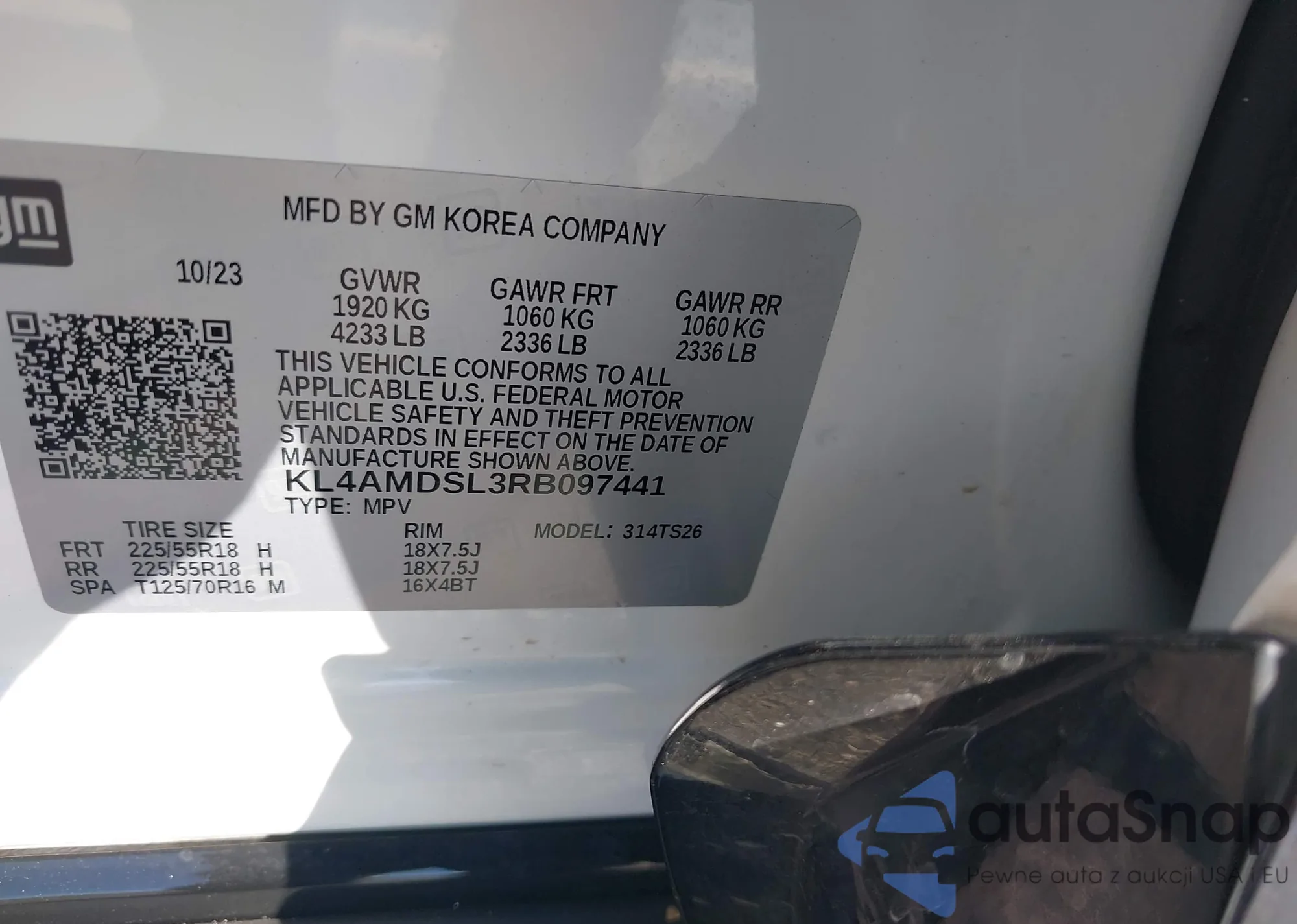 LOT: 44144729 VIN: KL4MMDSL4PB058626