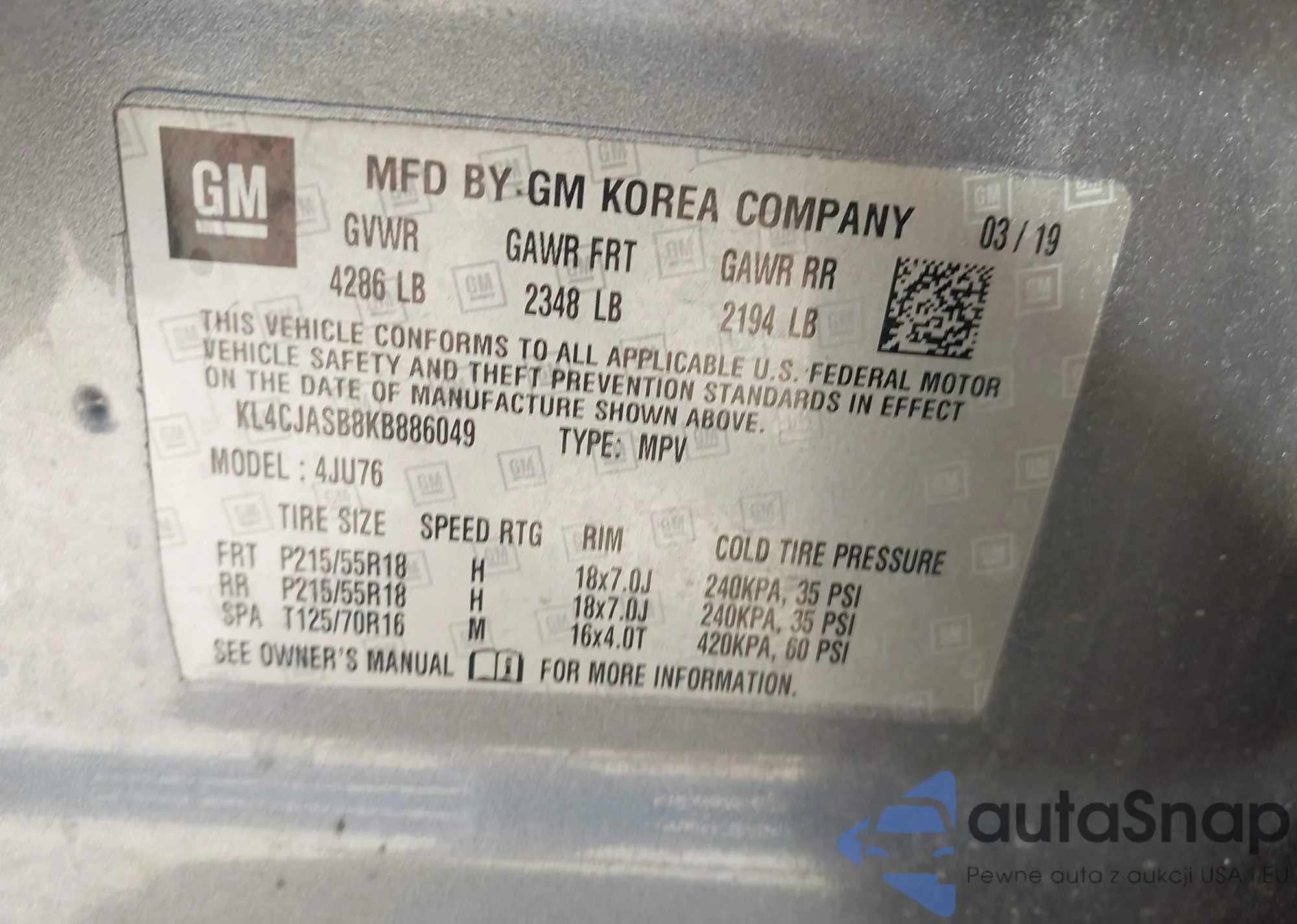 • VIN KL4CJASB8KB886049