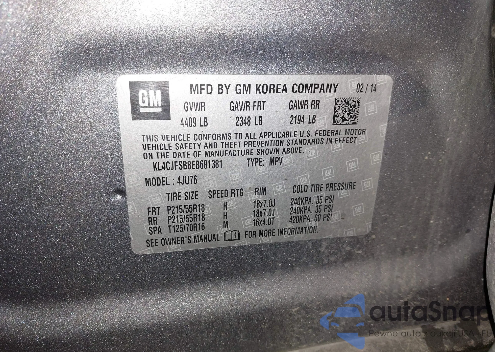 • VIN KL4CJFSB8EB681381