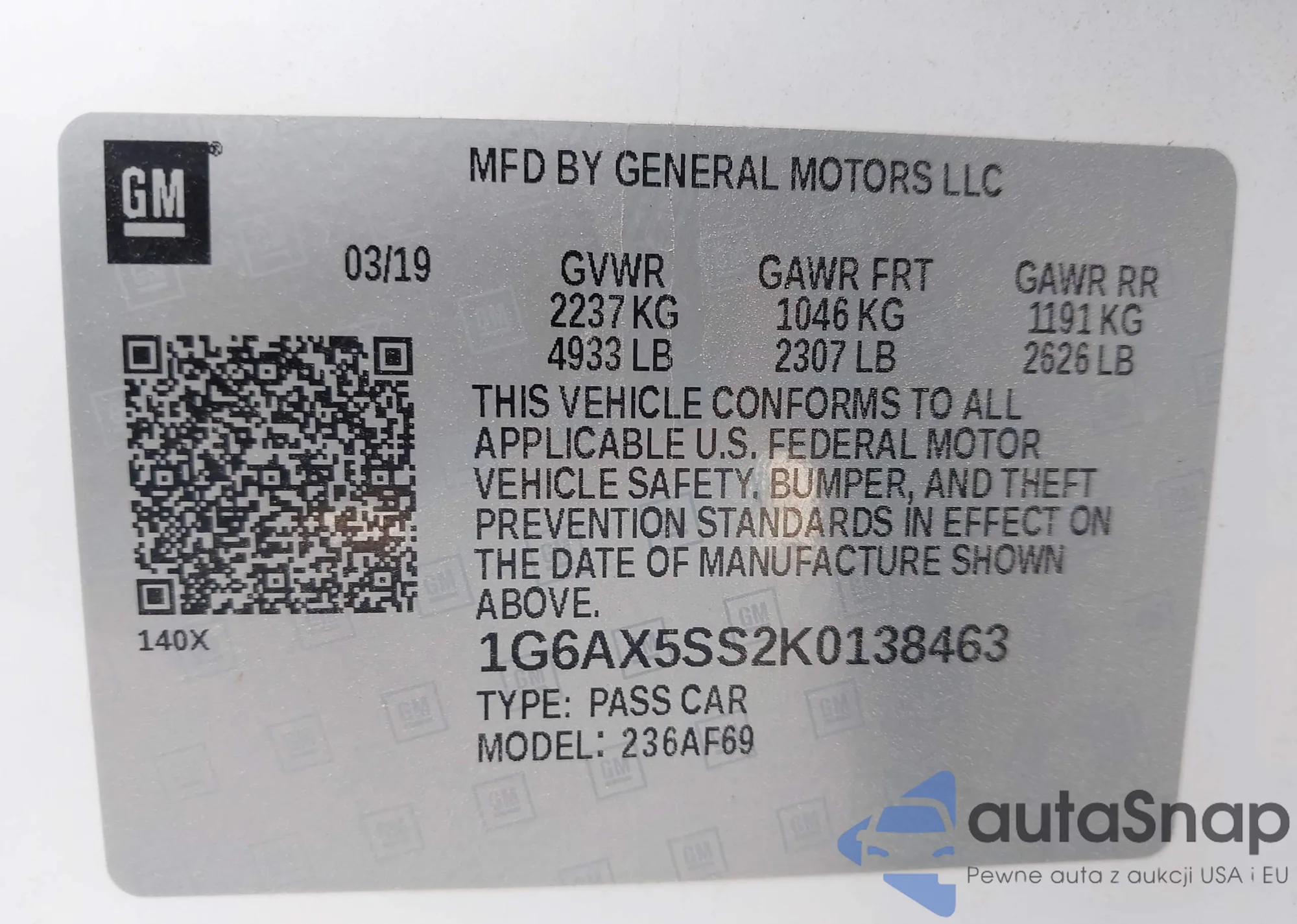 LOT: 92227405 VIN: 1G6AP5SX0K0133435