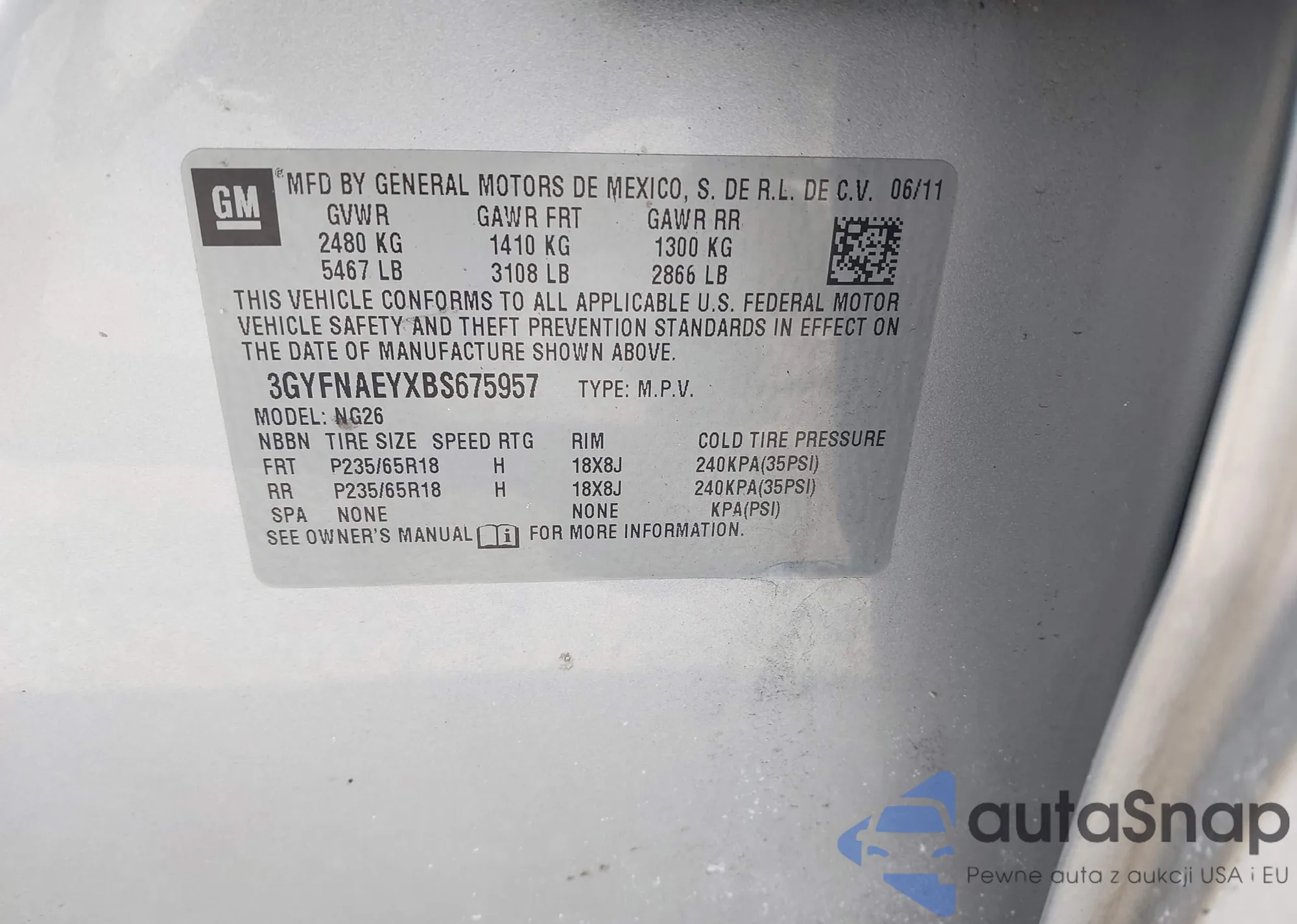 • VIN 3GYFNAEYXBS675957