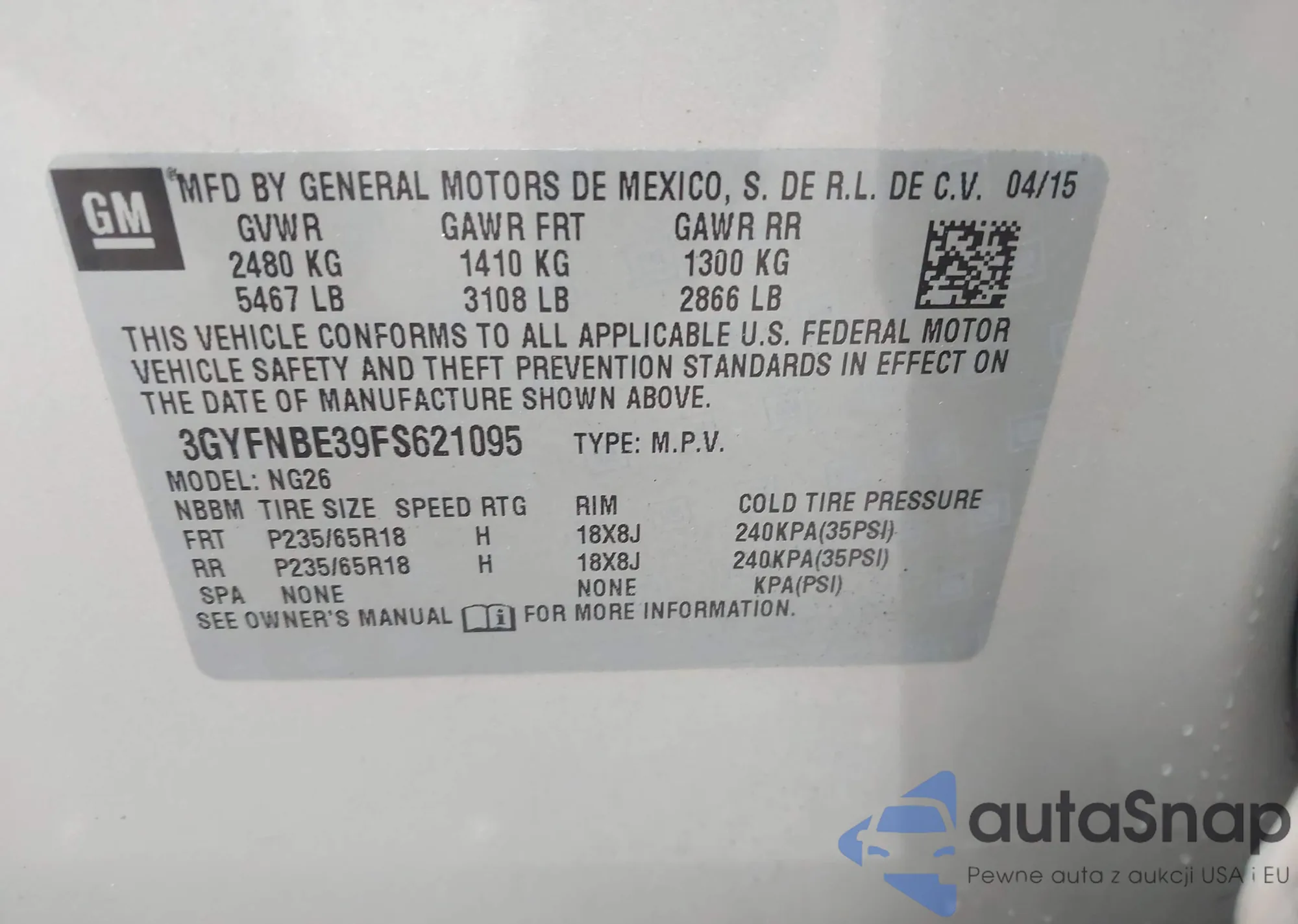 • VIN 3GYFNBE39FS621095