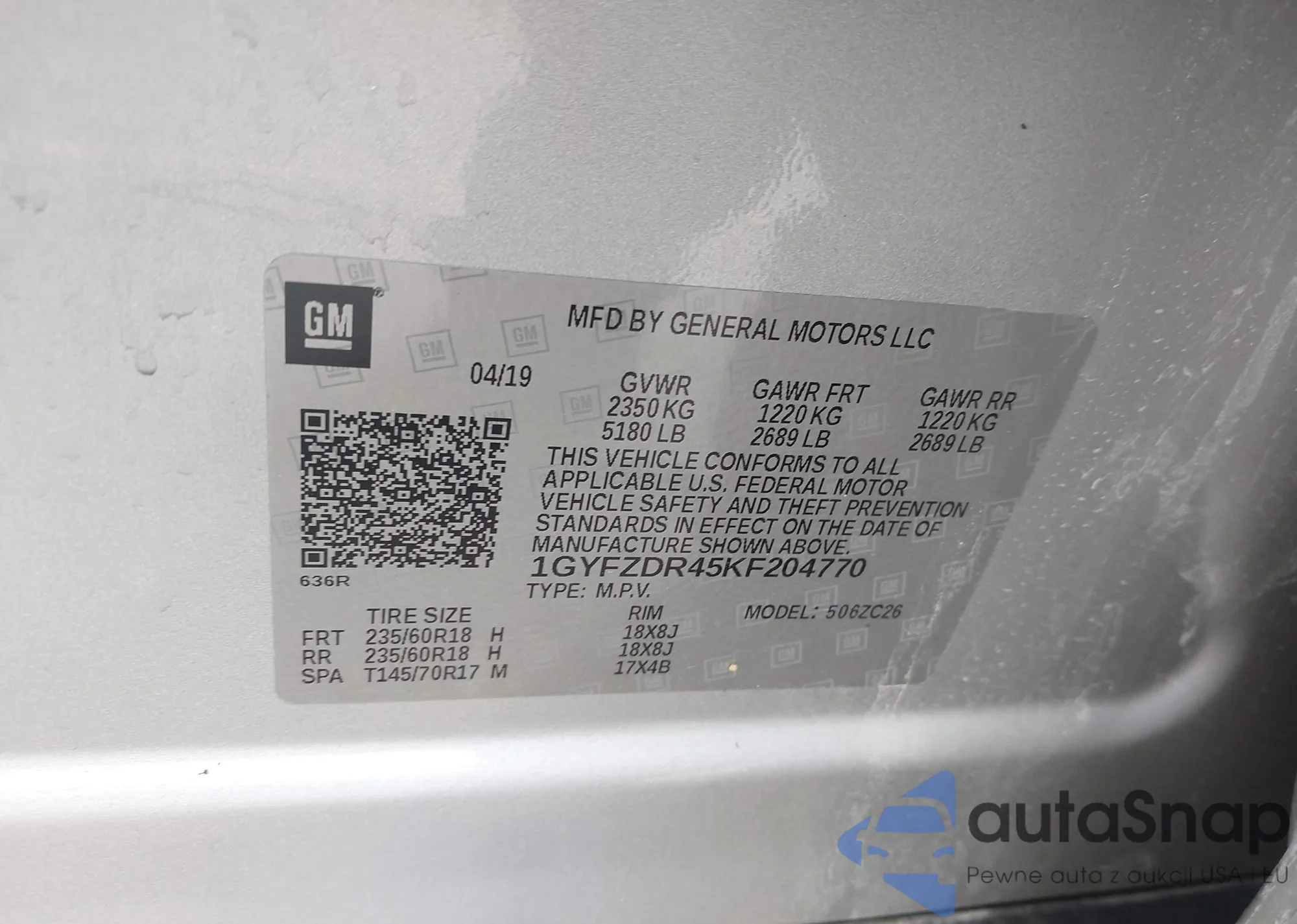 • VIN 1GYFZDR45KF204770
