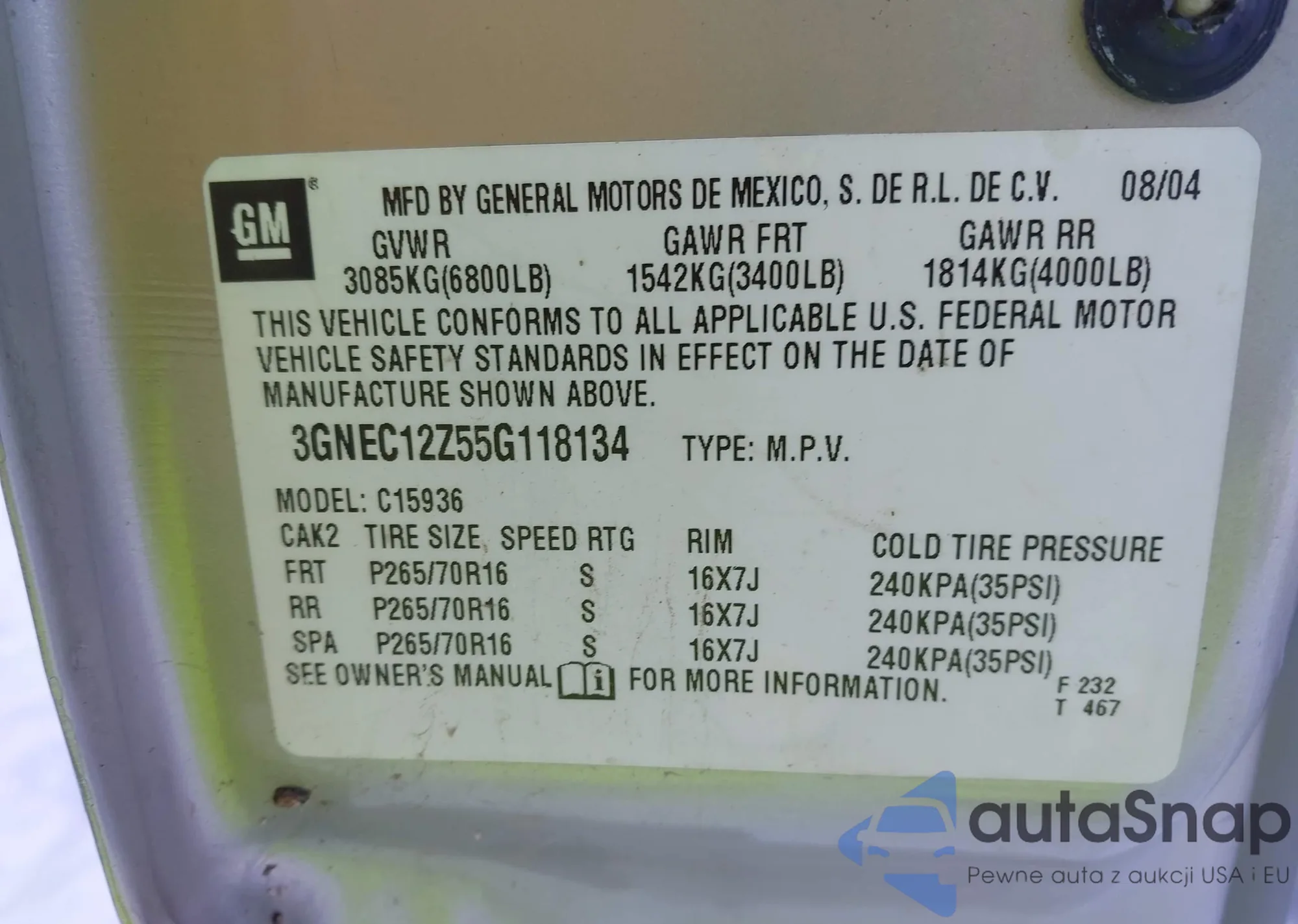 • VIN 3GNEC12Z35G221648