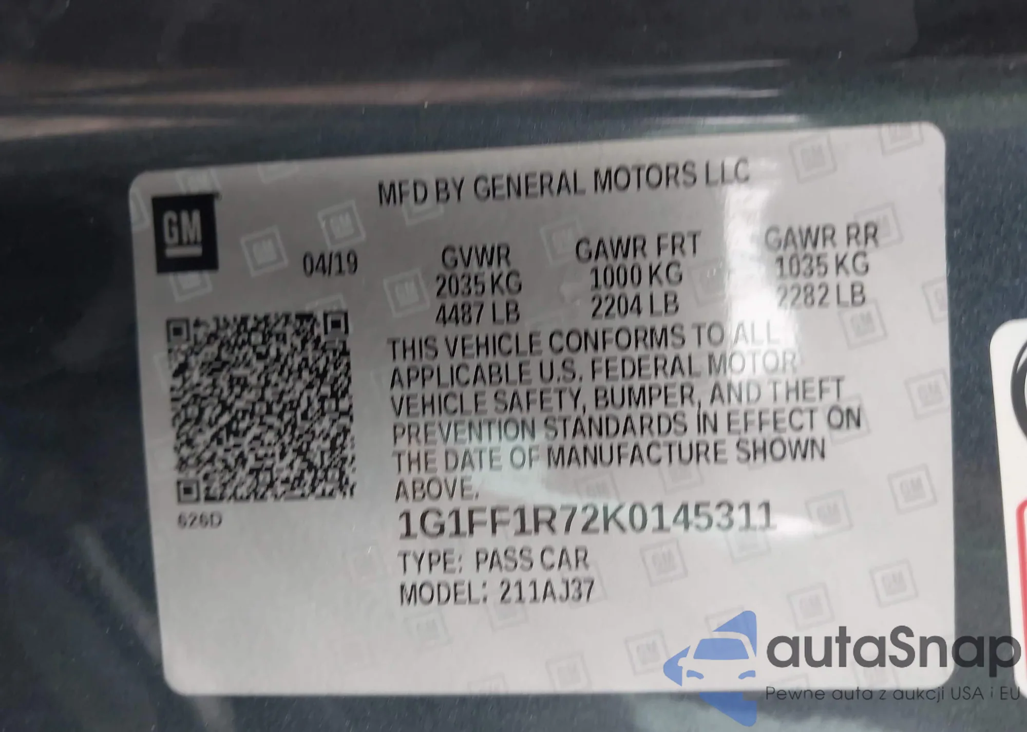 LOT: 44214051 VIN: 1G1FF1R72K0145311
