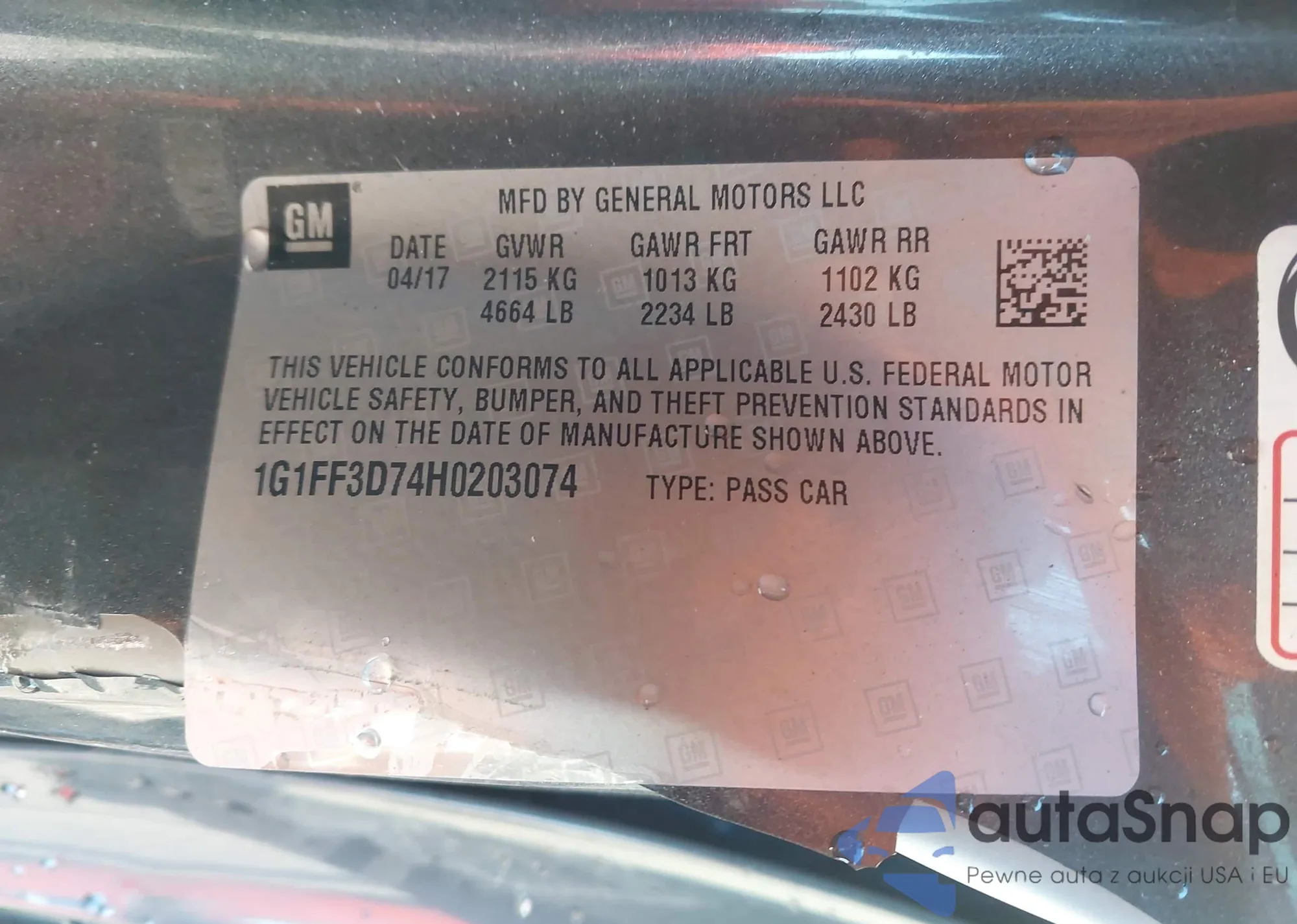 • VIN 1G1FF3D74H0203074