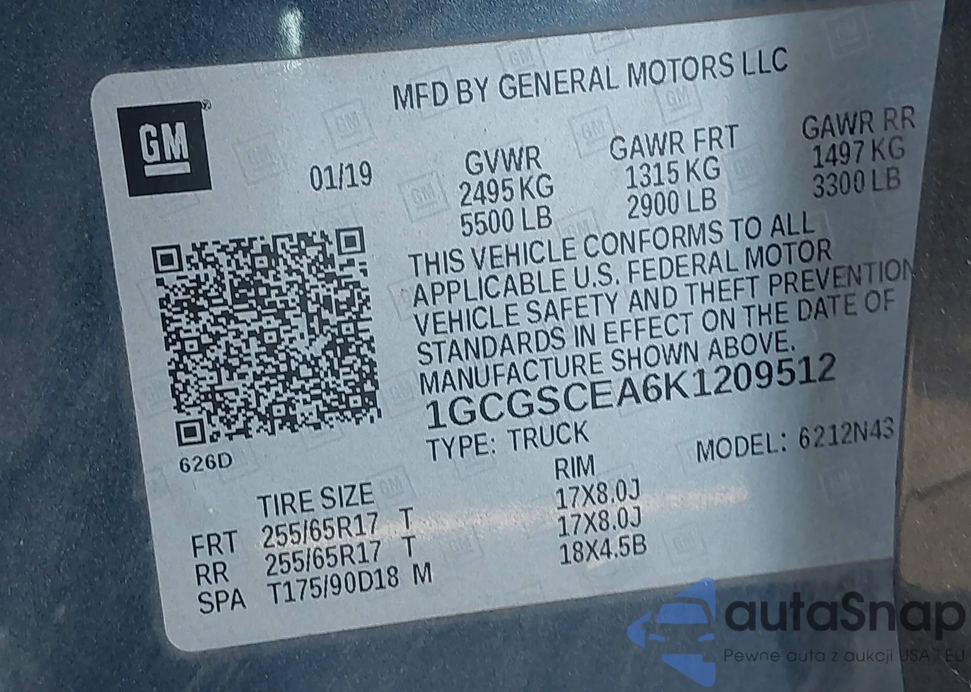 LOT: 43908802 VIN: 1GCGSCEA6K1209512