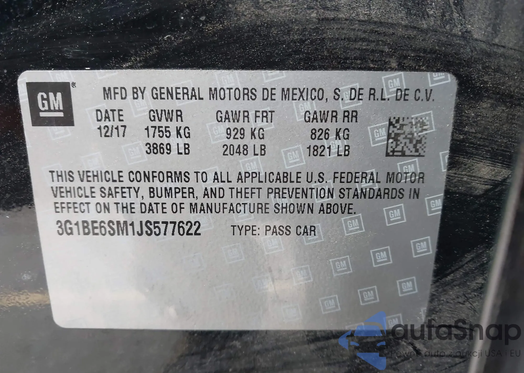 LOT: 44254311 VIN: 3G1BE6SM1JS577622