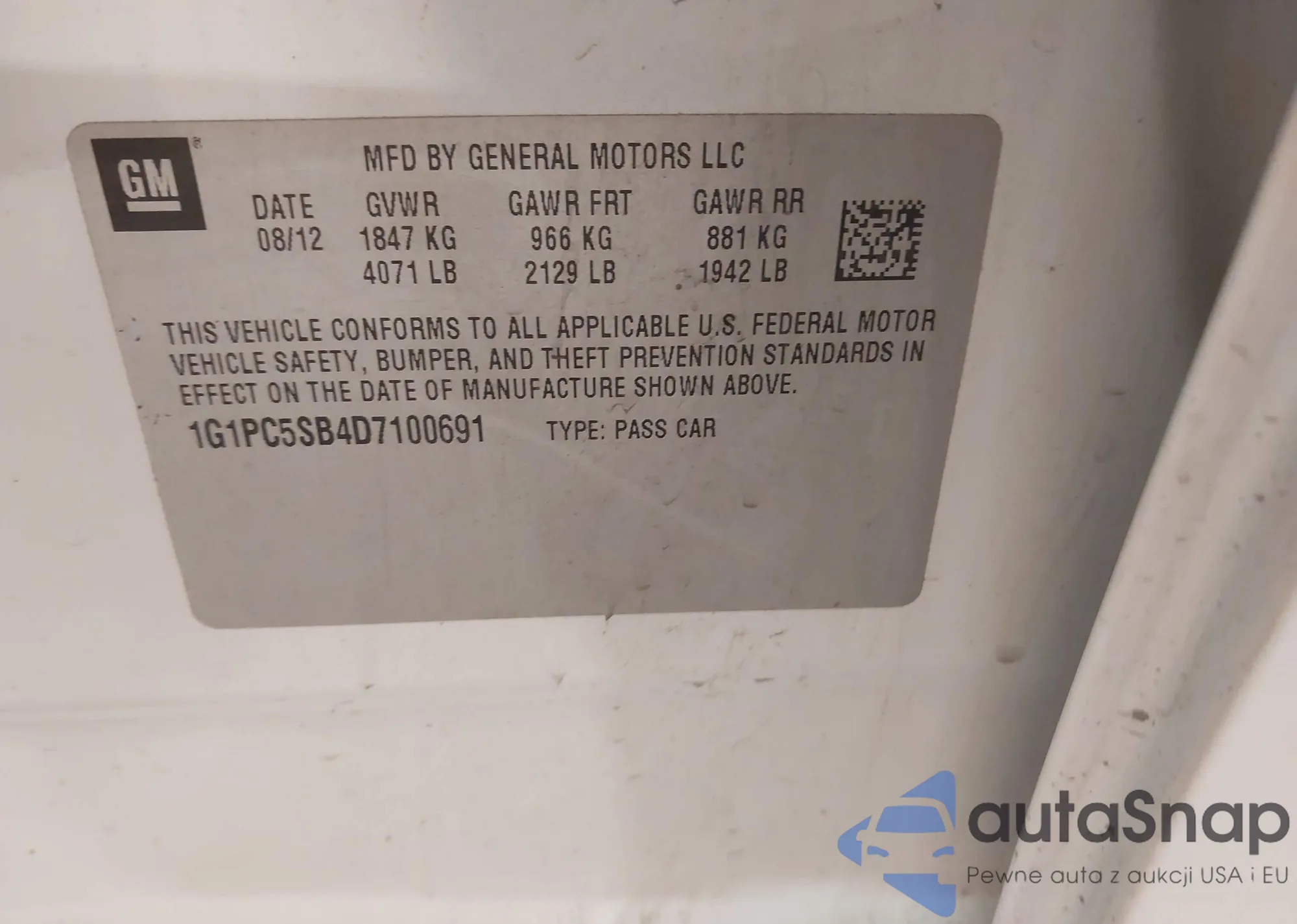 LOT: 44280839 VIN: 1G1PA5SH0D7261615