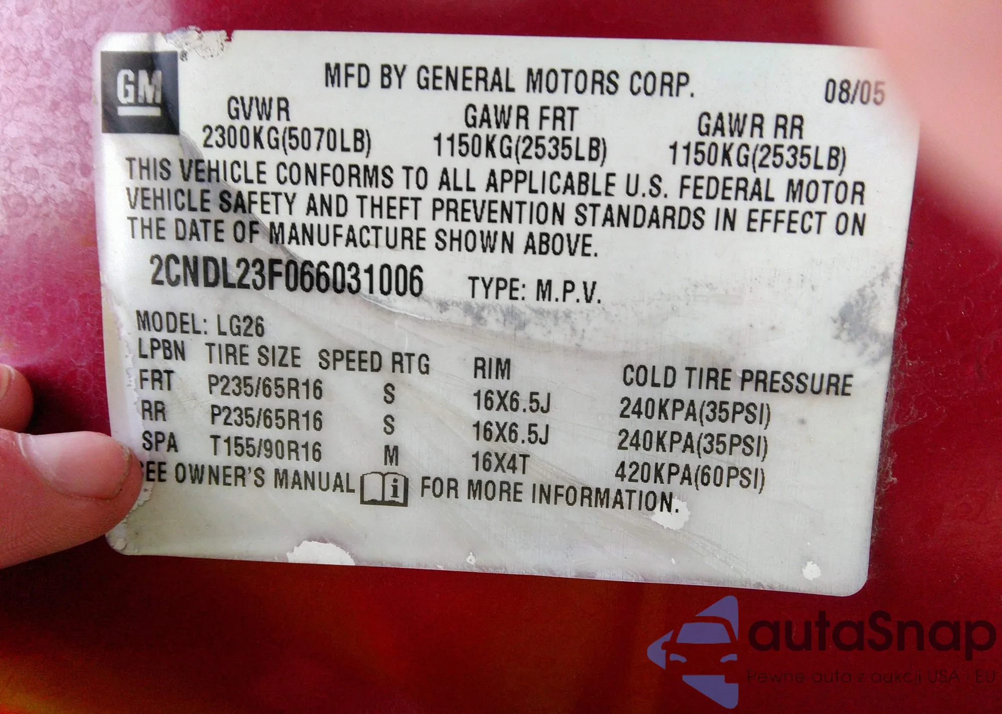 LOT: 38150032 VIN: 2CNDL23F066031006