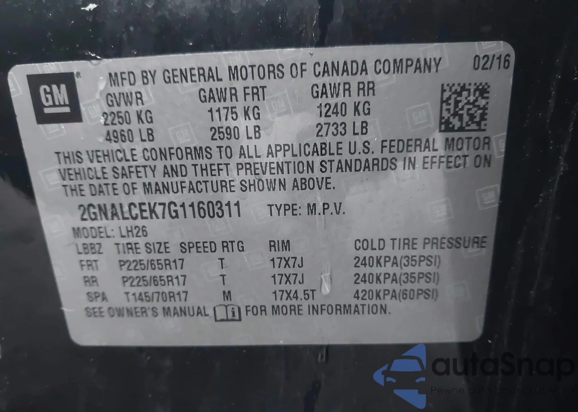• VIN 2GNALCEK7G1160311