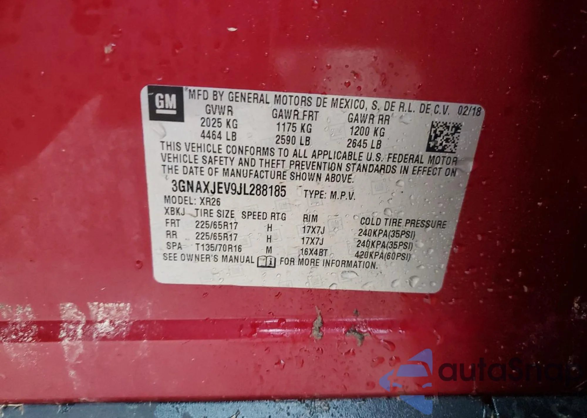 LOT: 69049395 VIN: 3GNAXJEV9JL288185