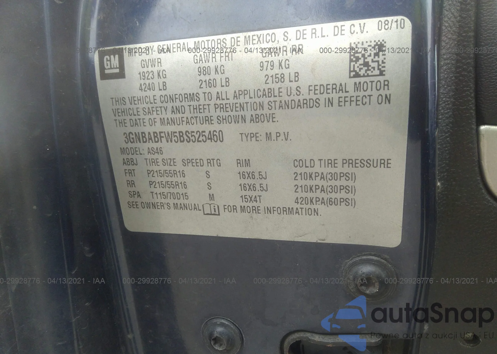 • VIN 3GNBABFW5BS525460