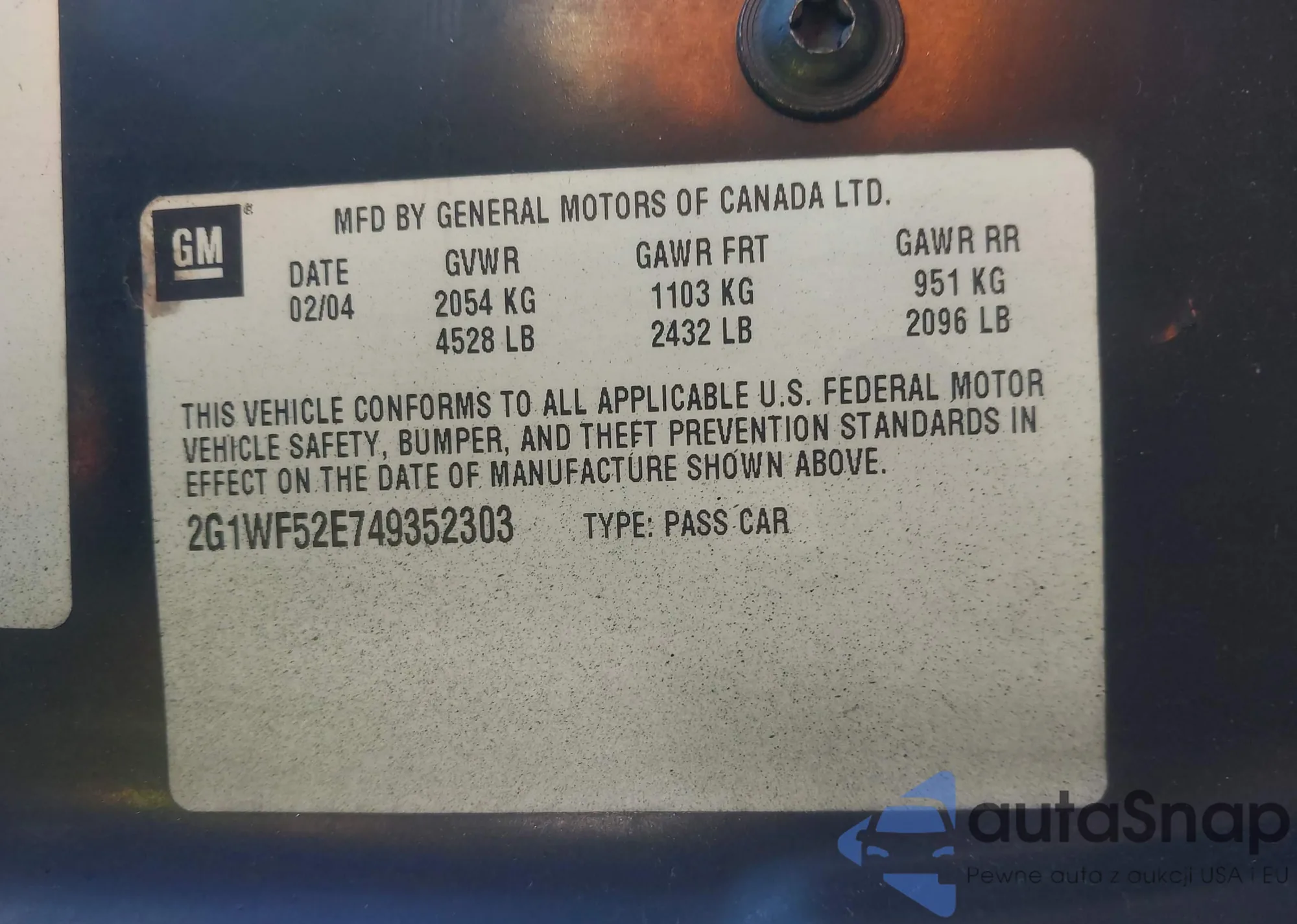 LOT: 43889594 VIN: 2G1WF52E749352303