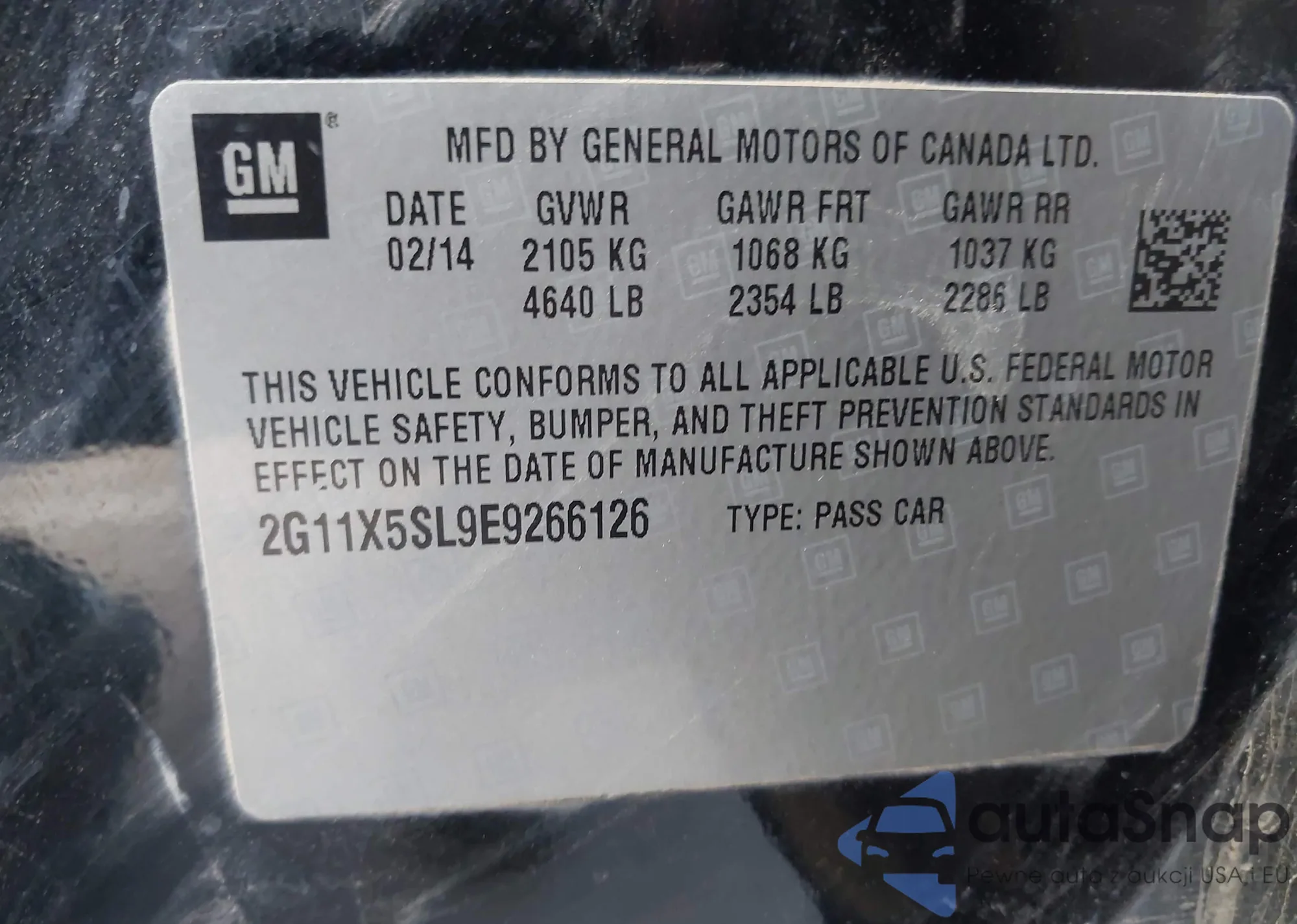 LOT: 44104556 VIN: 2G11X5SL9E9266126
