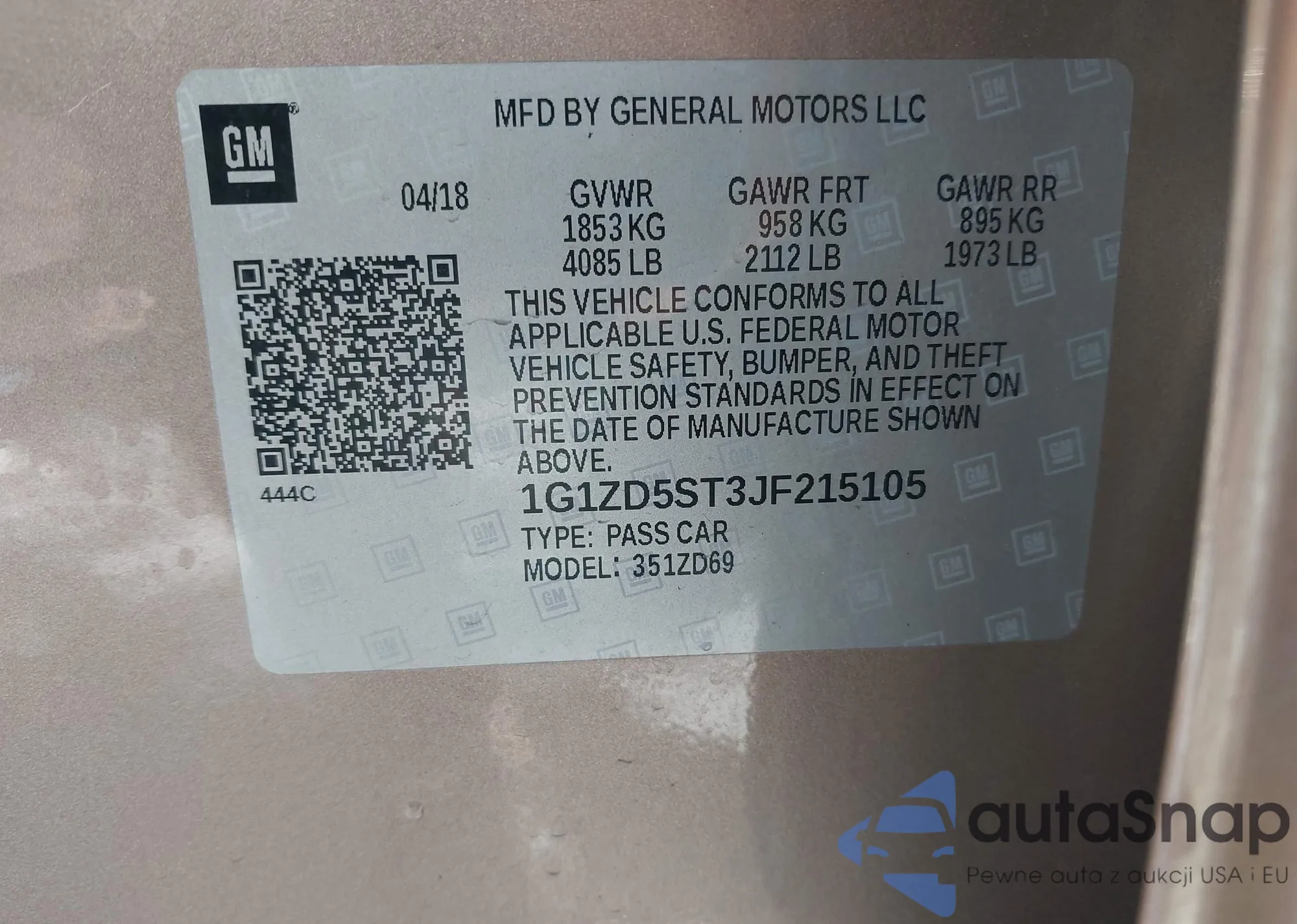 LOT: 44004531 VIN: 1G1ZD5ST3JF215105