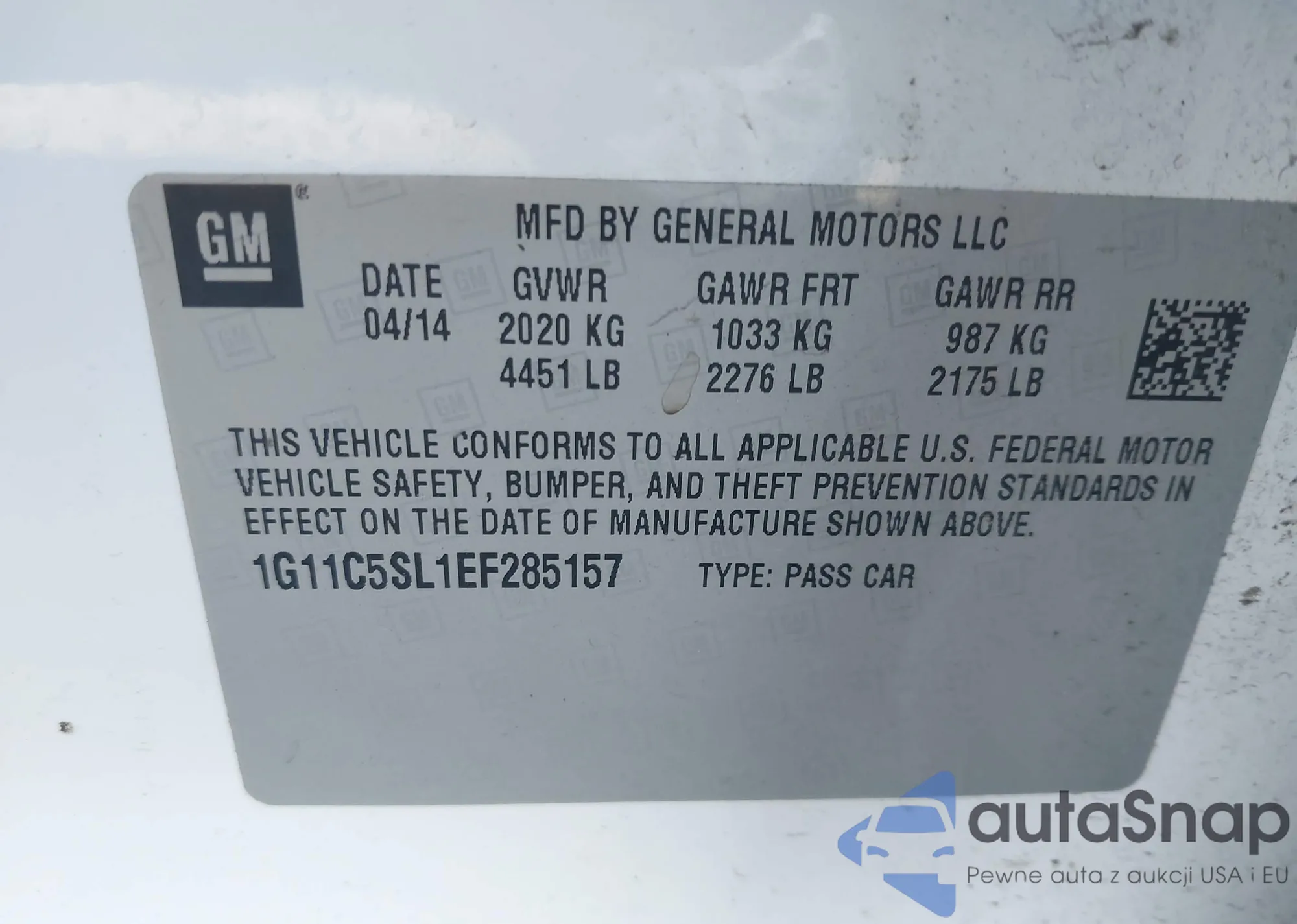 LOT: 38140552 VIN: 1G11C5SL1EF285157