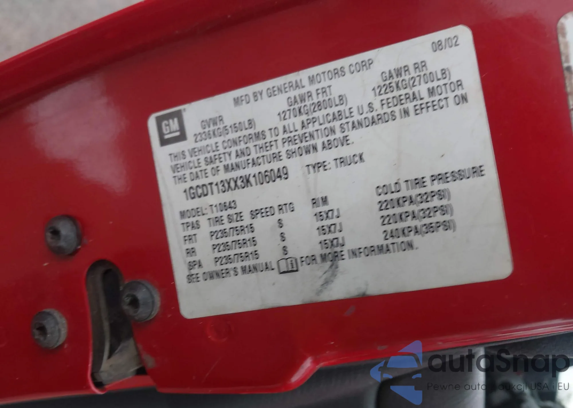 LOT: 44232371 VIN: 1GCDT13X93K127166