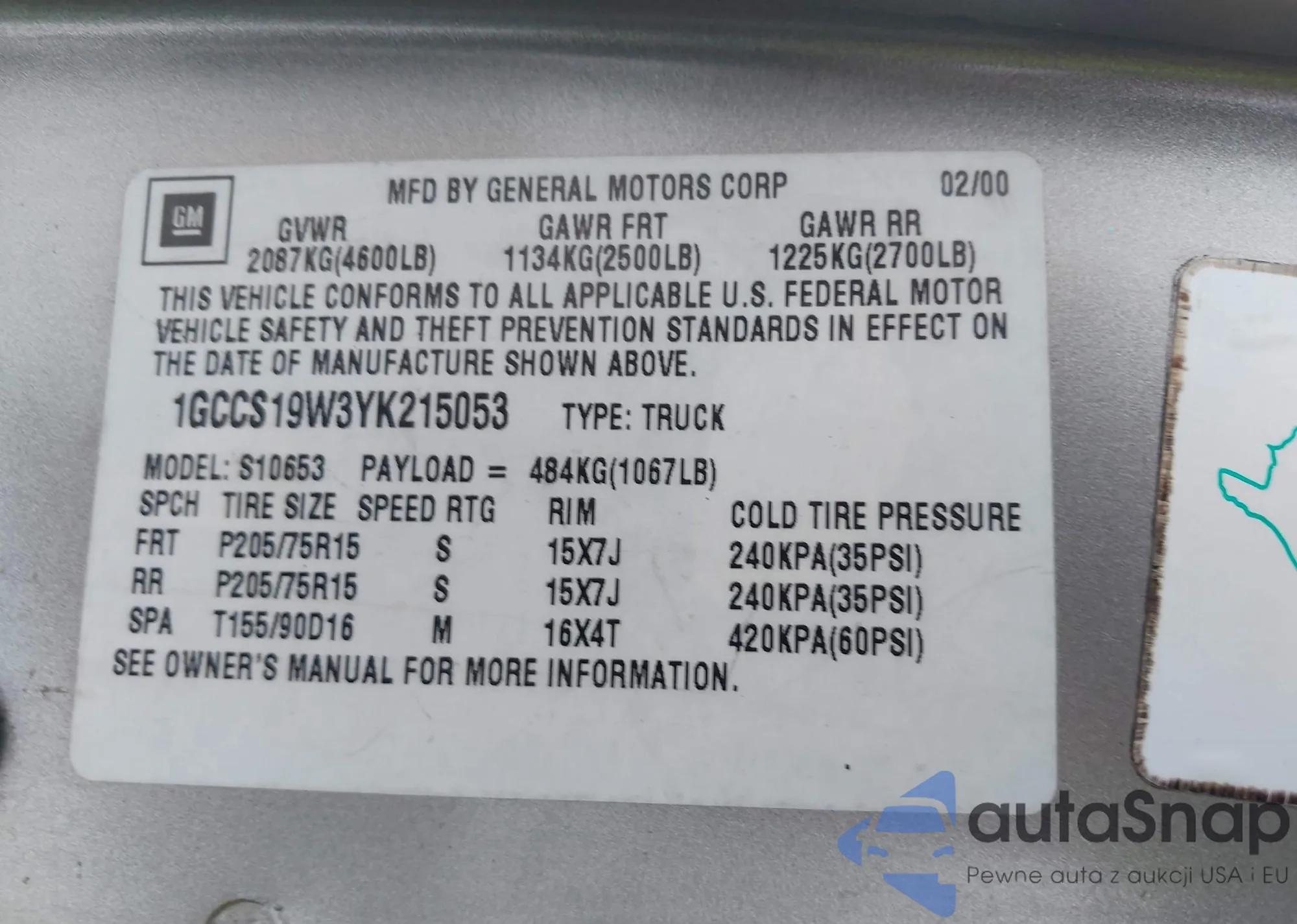 • VIN 1GCCS19W3YK215053