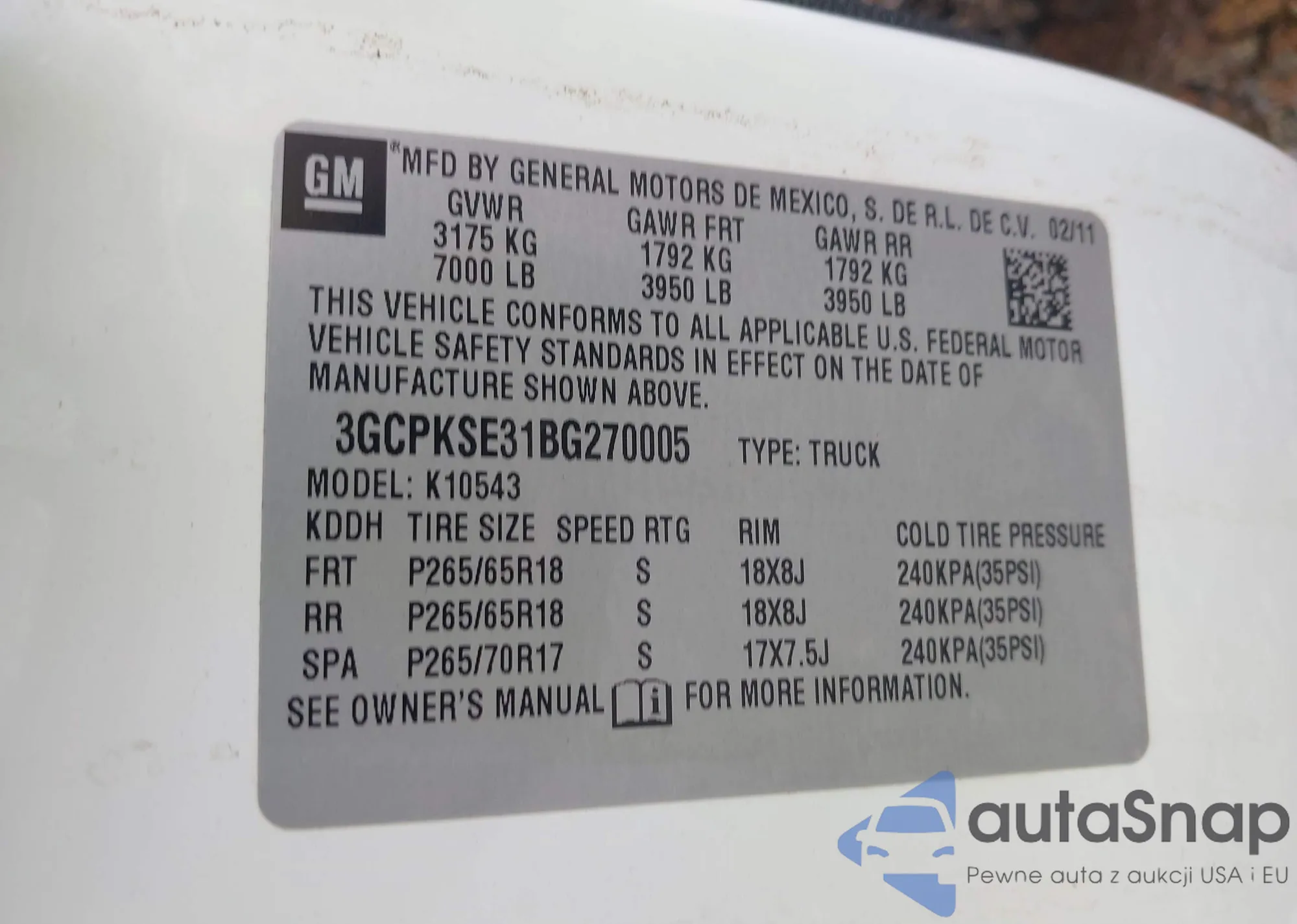 • VIN 3GCPKSE31BG270005