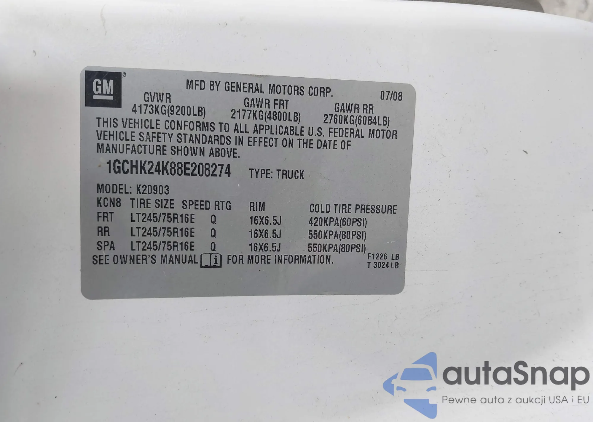 LOT: 43987697 VIN: 1GCHK24K88E208274