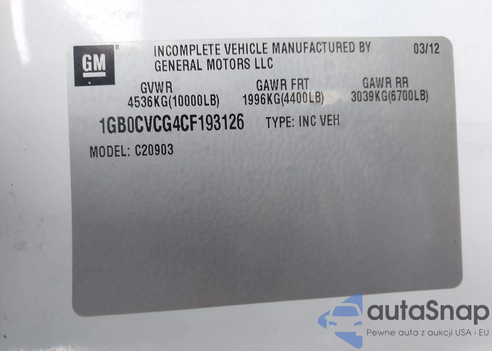LOT: 44372998 VIN: 1GB0CVCG4CF193126