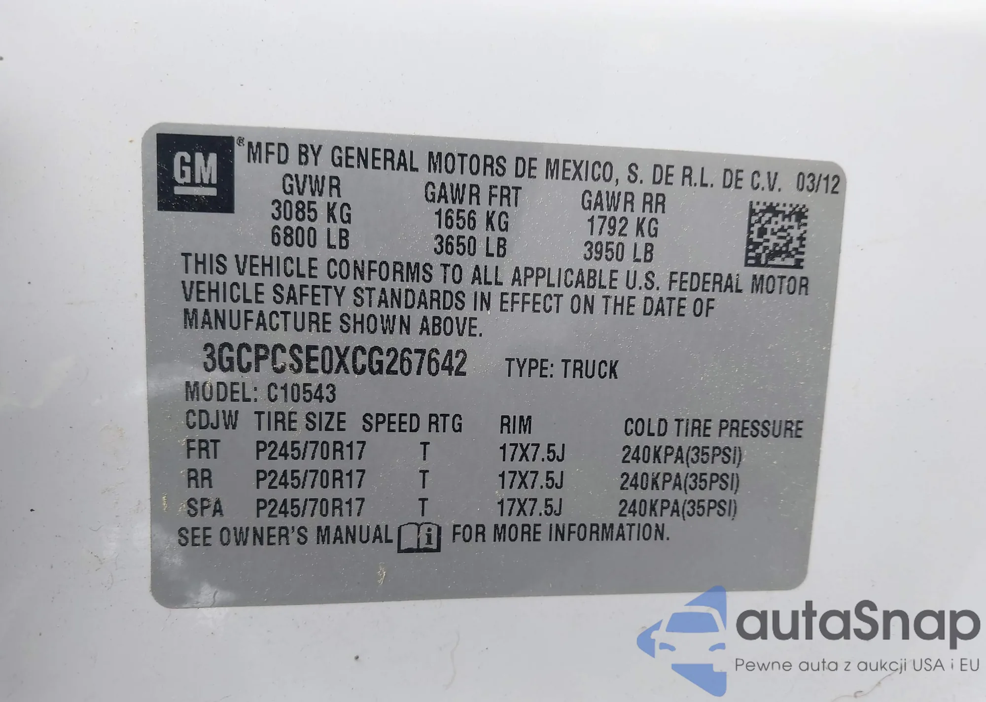 • VIN 3GCPCSE0XCG267642