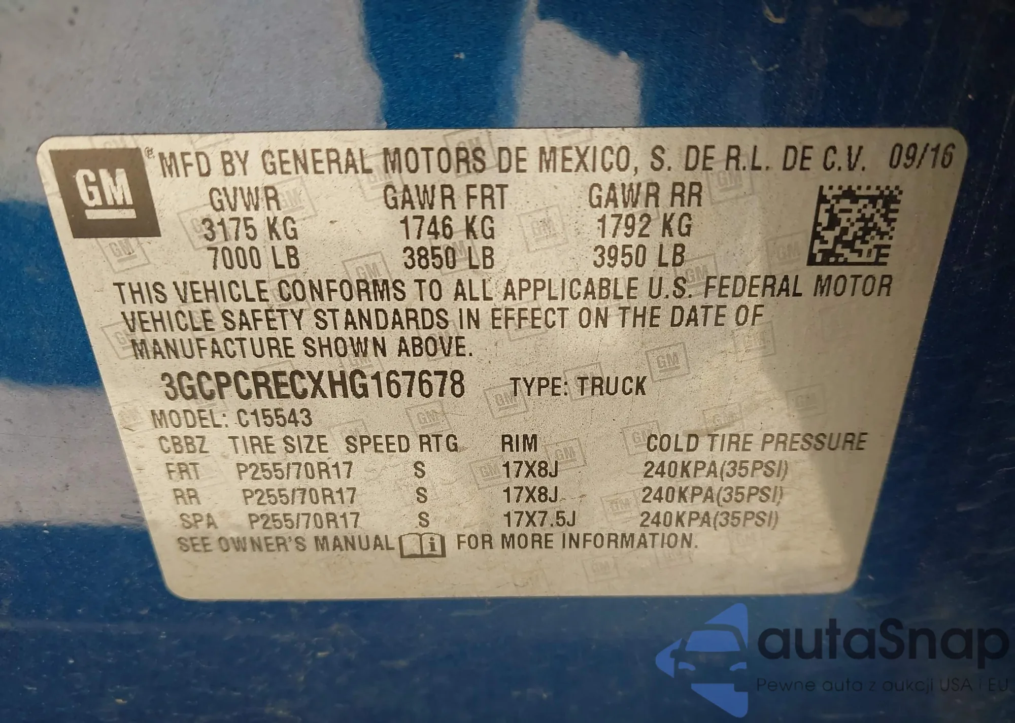 LOT: 43961015 VIN: 3GCPCRECXHG167678