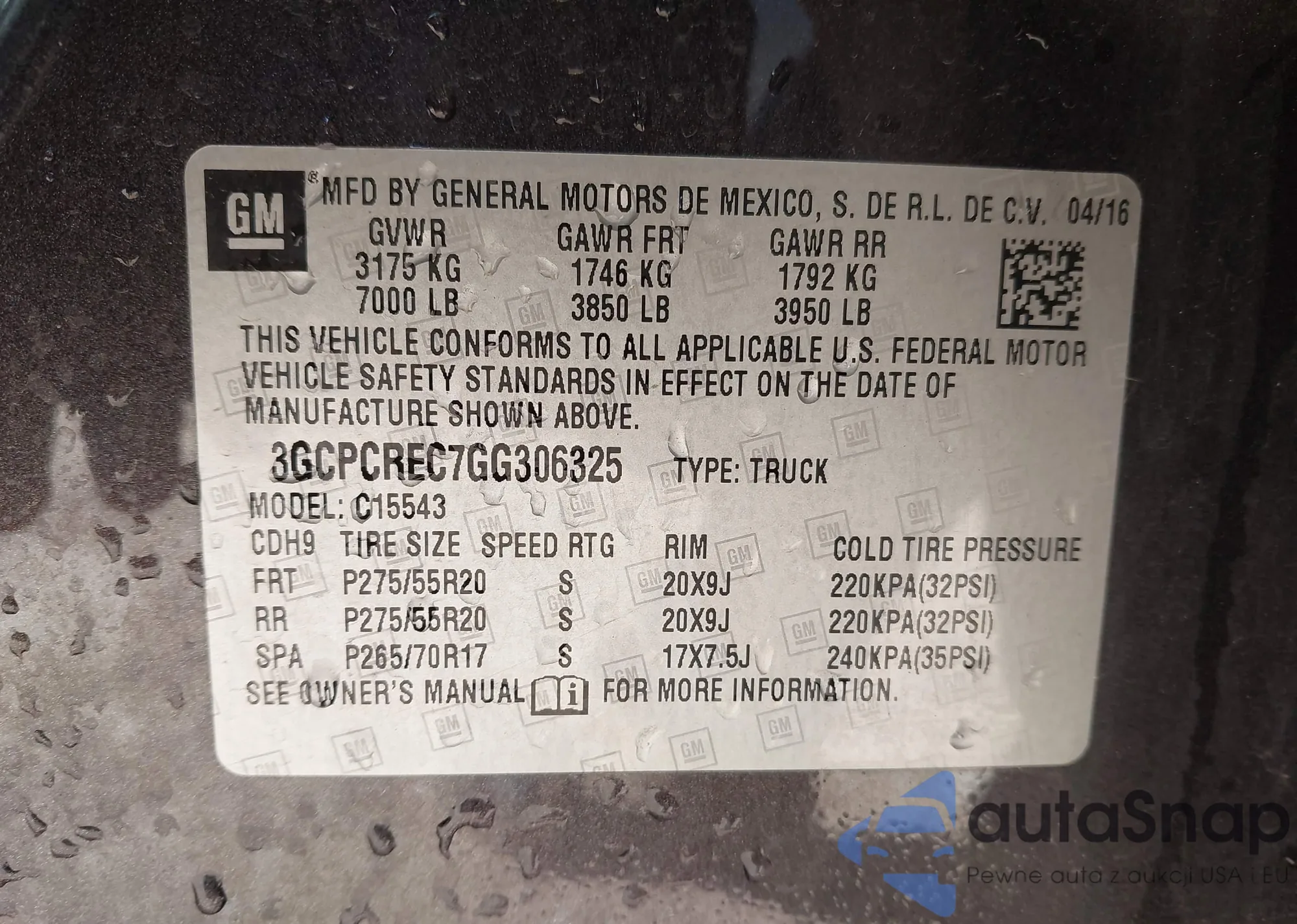LOT: 43868329 VIN: 3GCPCREC7GG306325