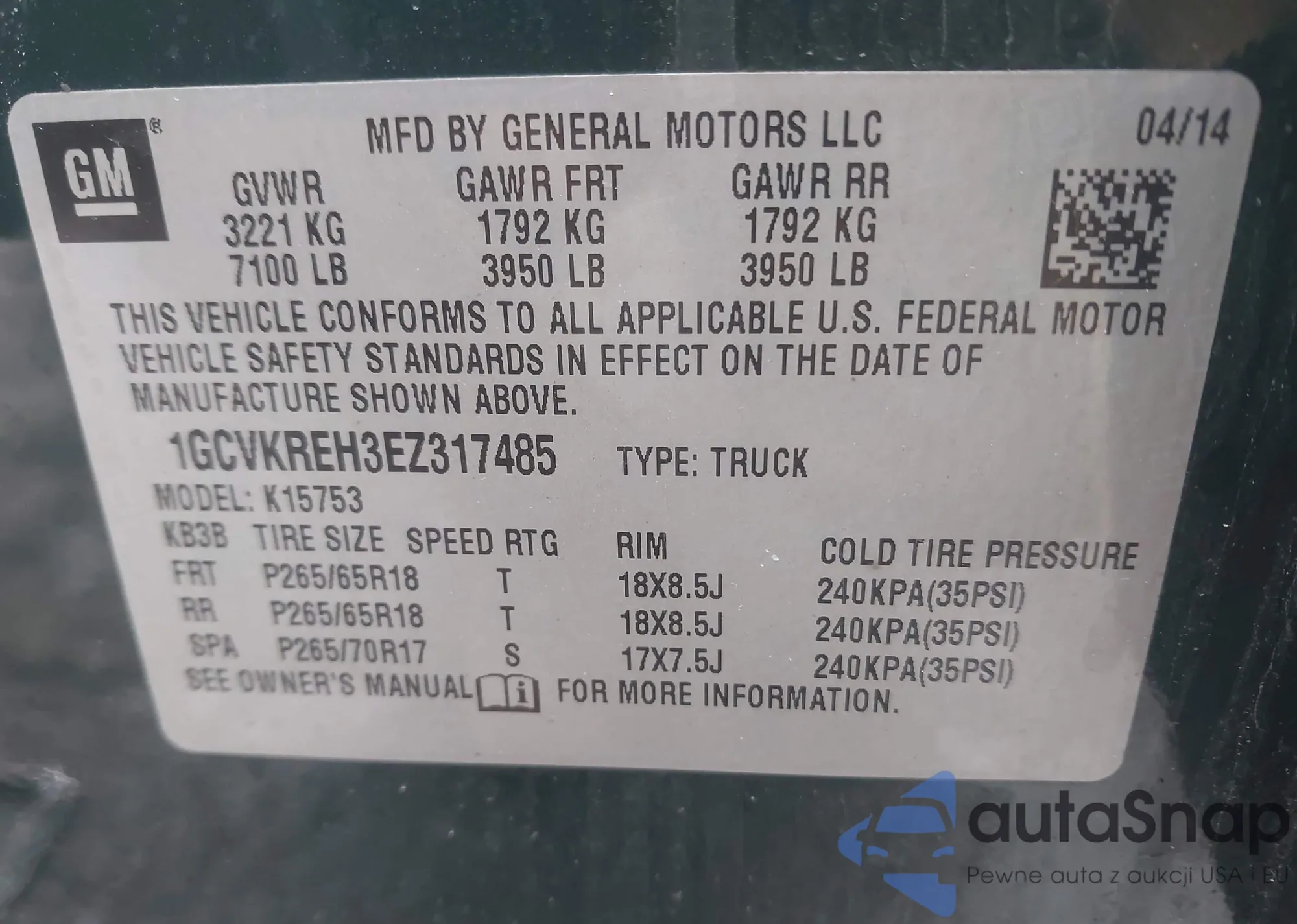 • VIN 1GCVKREH3EZ317485