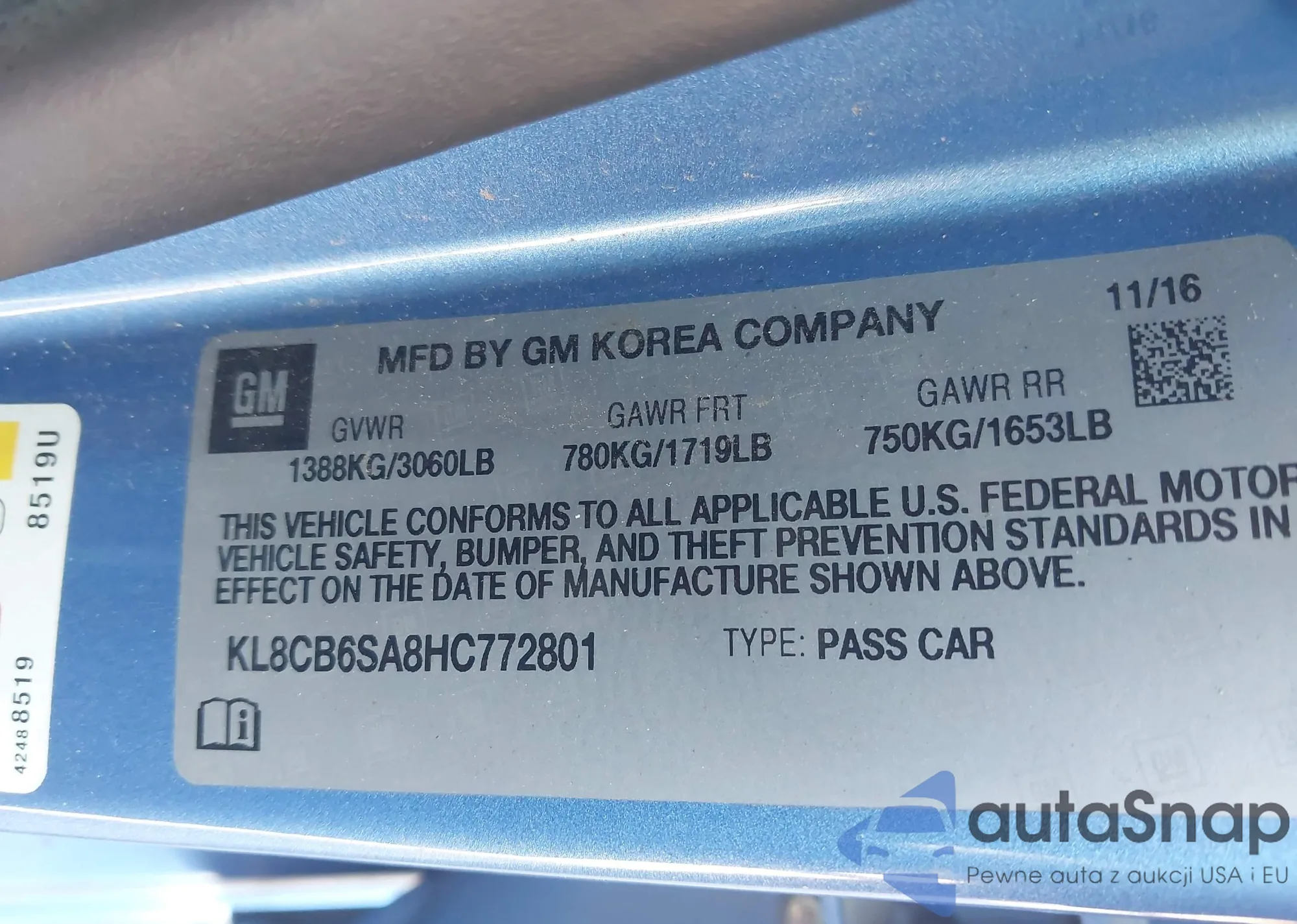 • VIN KL8CB6SA8HC772801
