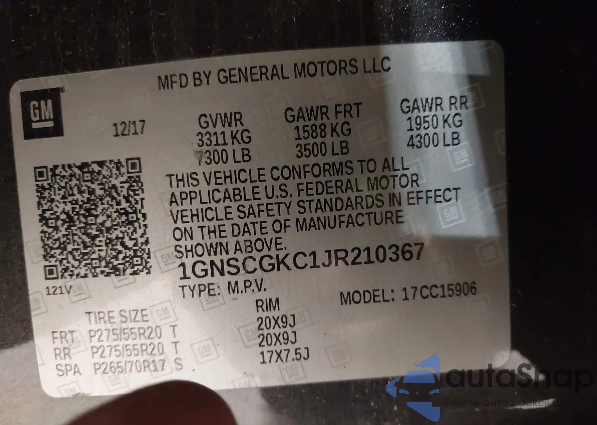 LOT: 43916275 VIN: 1GNSCGKC1JR210367