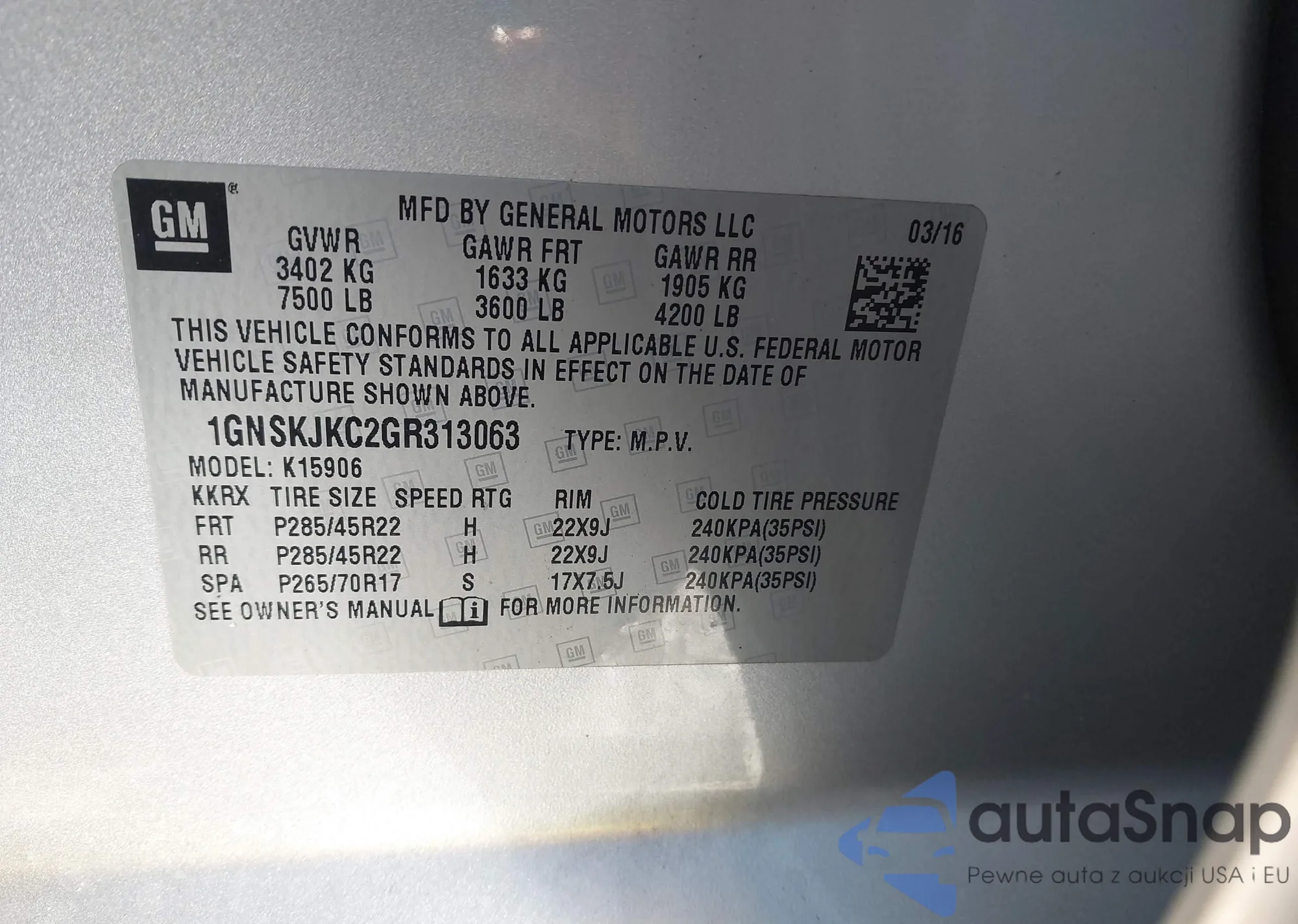 LOT: 44143759 VIN: 1GNSKJKC2GR313063