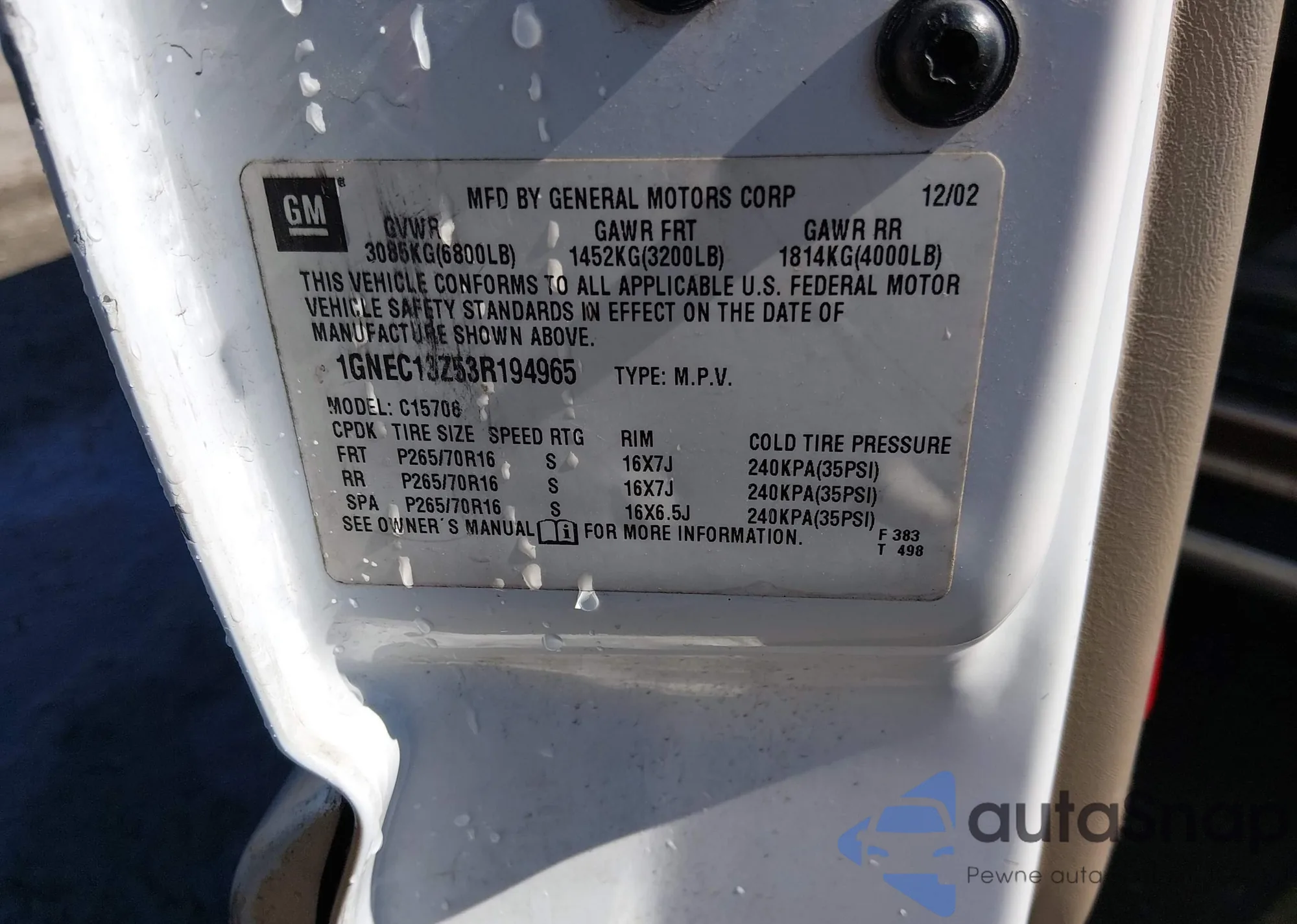 • VIN 1GNEC13Z53R194965