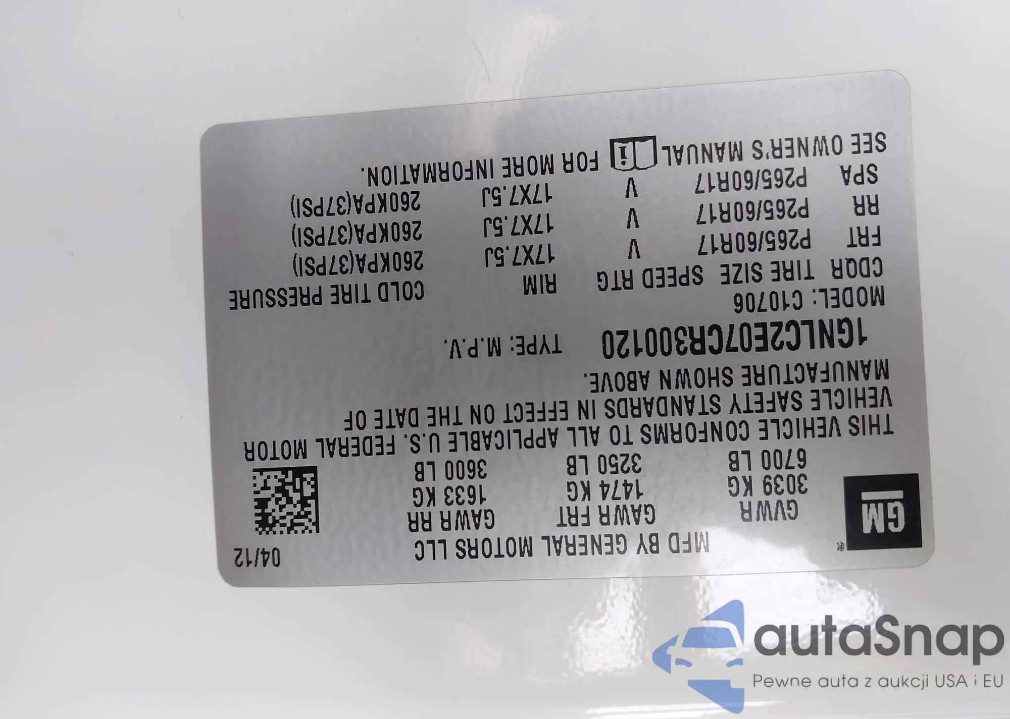 • VIN 1GNLC2E07CR300120