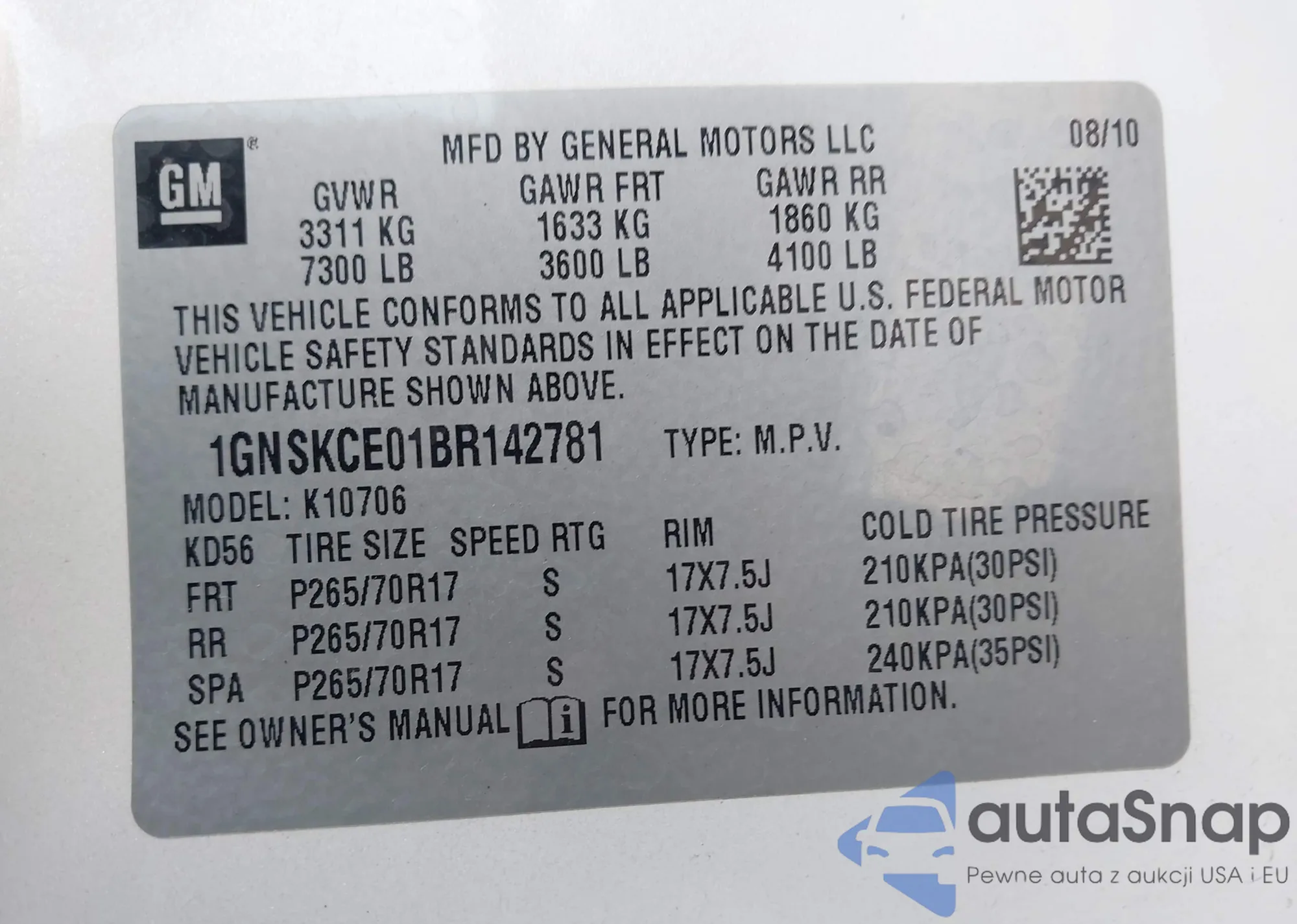 LOT: 43955053 VIN: 1GNSKCE01BR142781