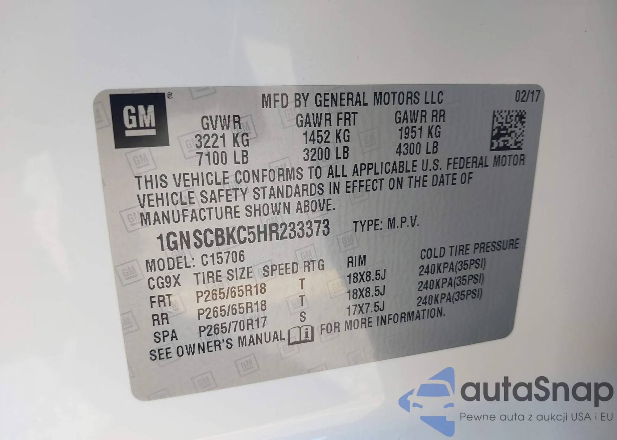 LOT: 44081004 VIN: 1GNSCBKC5HR233373