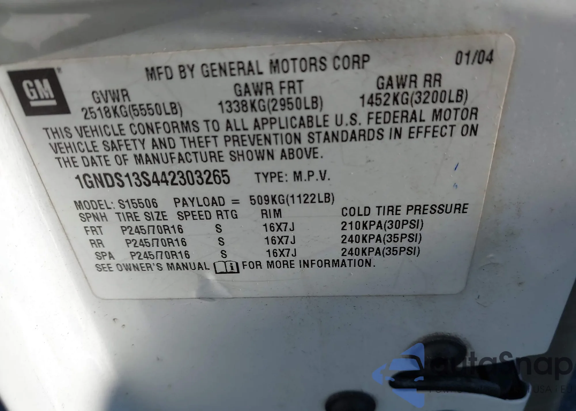LOT: 44292292 VIN: 1GNDT13S742220121