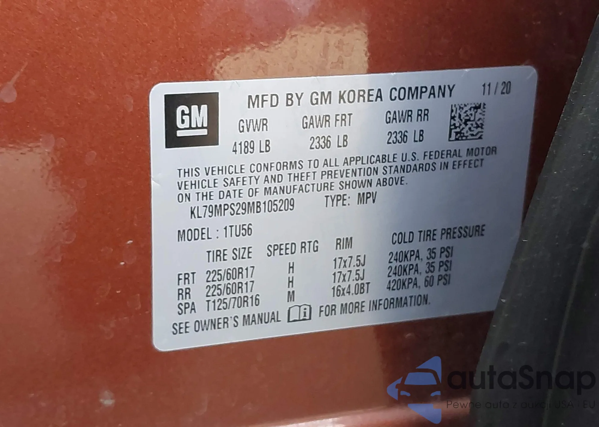 • VIN KL79MRSL3MB117411
